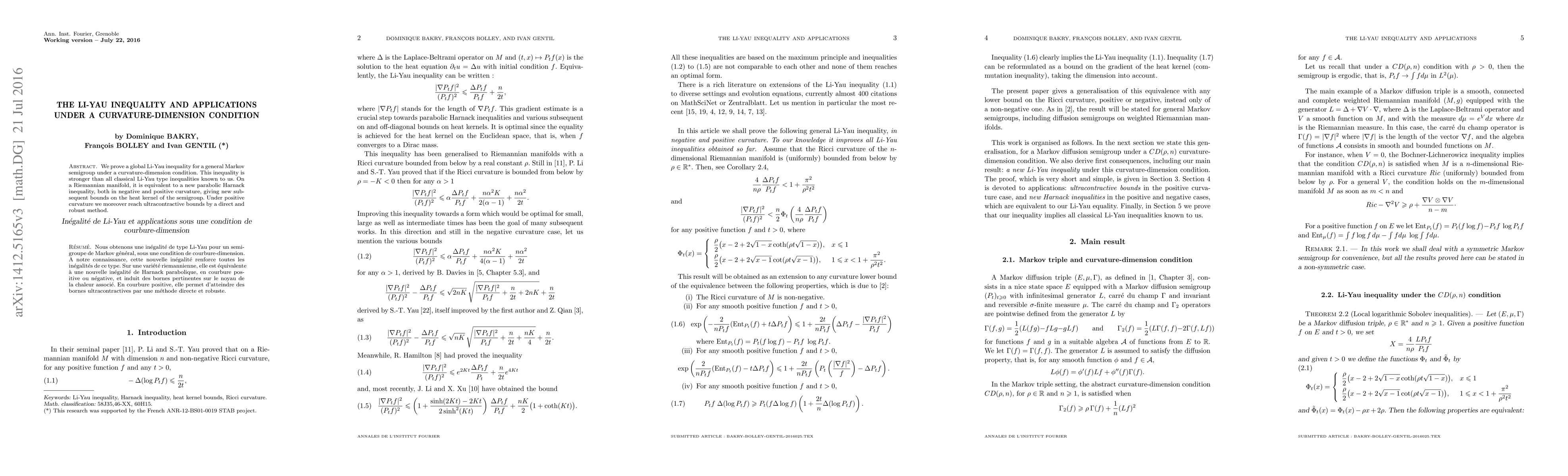 Summary: This paper establishes a new global Li-Yau inequality for Markov semigroups under a curvature-dimension condition, which implies a novel parabolic Harnack inequality and provides stronger bounds on the heat kernel, including ultracontractive bounds under positive curvature.