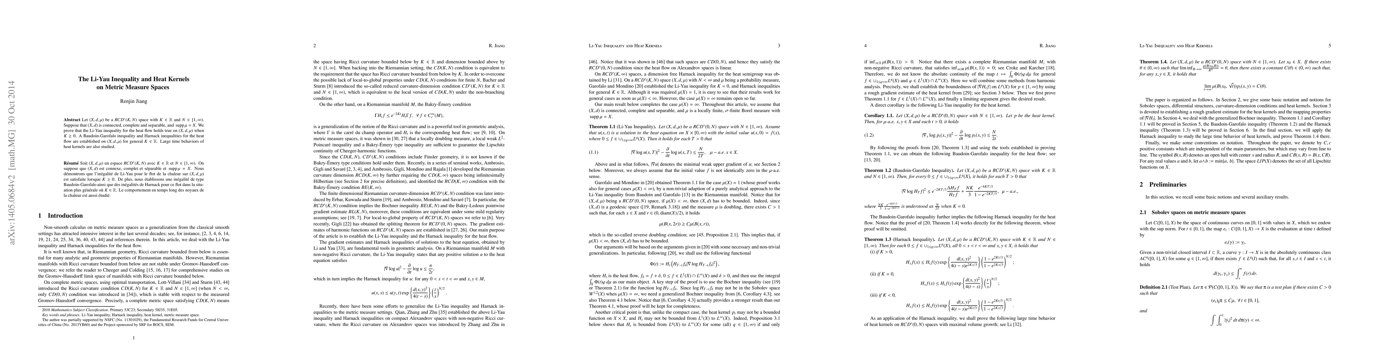 This paper proves the Li-Yau inequality for heat flows on $RCD^*(K, N)$ metric measure spaces when $K \geq 0$, establishes Baudoin-Garofalo inequalities and Harnack inequalities for heat flows for any $K \in \mathbb{R}$, and examines the large time behavior of heat kernels.