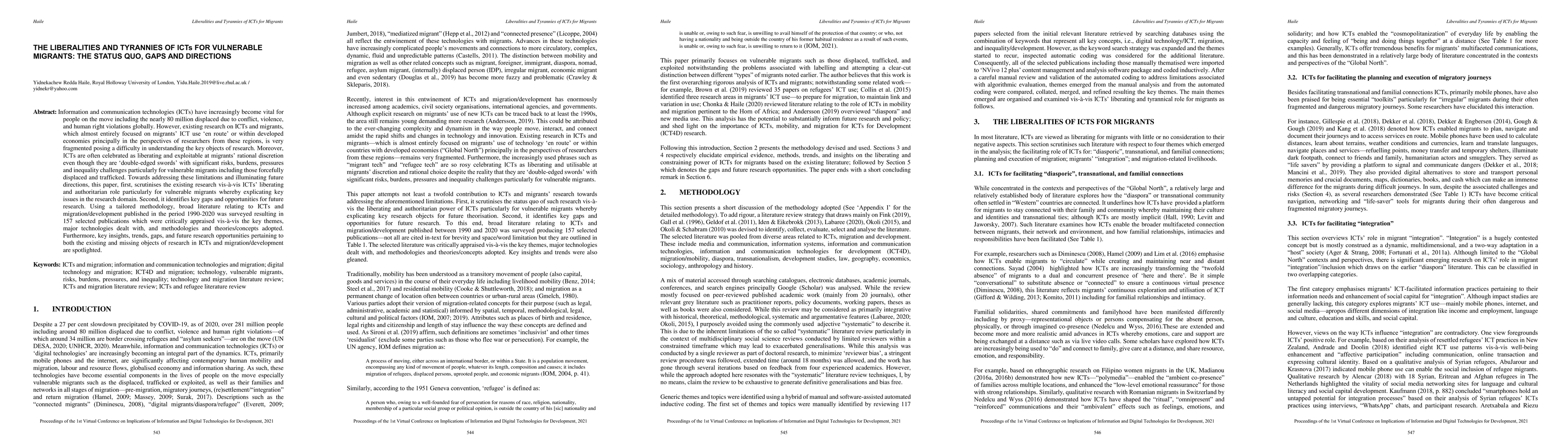 Information and communication technologies (ICTs) have increasingly become vital for people on the move including the nearly 80 million displaced due to conflict, violence, and human right violations globally. However, existing research on ICTs and migrants, which almost entirely focused on migrants' ICT use 'en route' or within developed economies principally in the perspectives of researchers from these regions, is very fragmented posing a difficulty in understanding the key objects of research. Moreover, ICTs are often celebrated as liberating and exploitable at migrants' rational discretion even though they are 'double-edged swords' with significant risks, burdens, pressures and inequality challenges particularly for vulnerable migrants including those forcefully displaced and trafficked. Towards addressing these limitations and illuminating future directions, this paper, first, scrutinises the existing research vis-a-vis ICTs' liberating and authoritarian role particularly for vulnerable migrants whereby explicating key issues in the research domain. Second, it identifies key gaps and opportunities for future research. Using a tailored methodology, broad literature relating to ICTs and migration/development published in the period 1990-2020 was surveyed resulting in 157 selected publications which were critically appraised vis-a-vis the key themes, major technologies dealt with, and methodologies and theories/concepts adopted. Furthermore, key insights, trends, gaps, and future research opportunities pertaining to both the existing and missing objects of research in ICTs and migration/development are spotlighted.