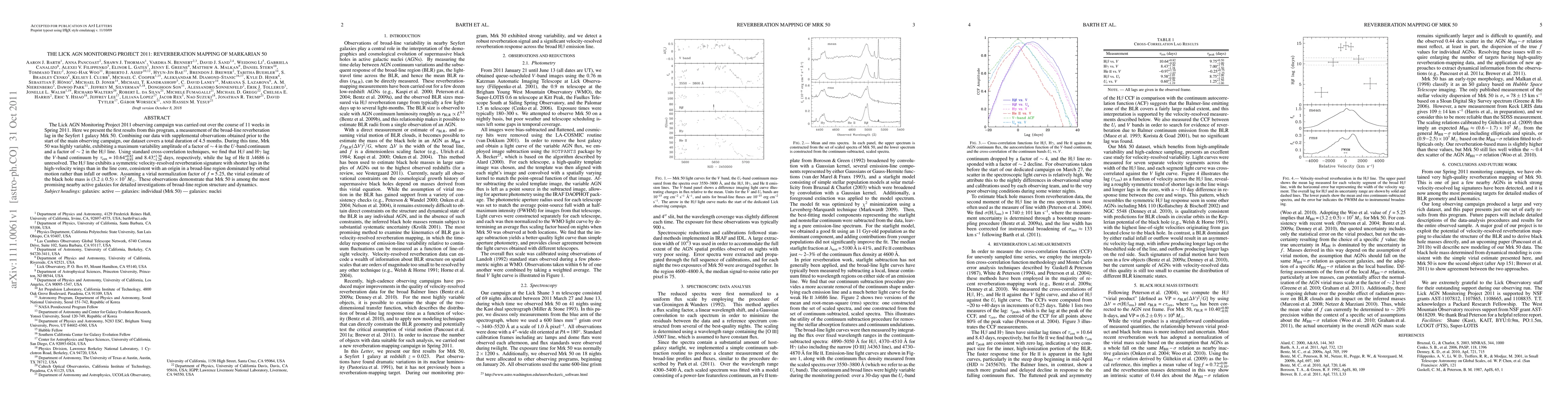 The Lick AGN Monitoring Project 2011 measured the broad-line reverberation lag in the Seyfert 1 galaxy Mrk 50, finding H-beta and H-gamma lag the V-band continuum by 10.64 and 8.43 days respectively. The H-beta line's symmetric lag pattern suggests a broad-line region dominated by orbital motion, leading to a virial black hole mass estimate of (3.2±0.5)×10^7 solar masses.