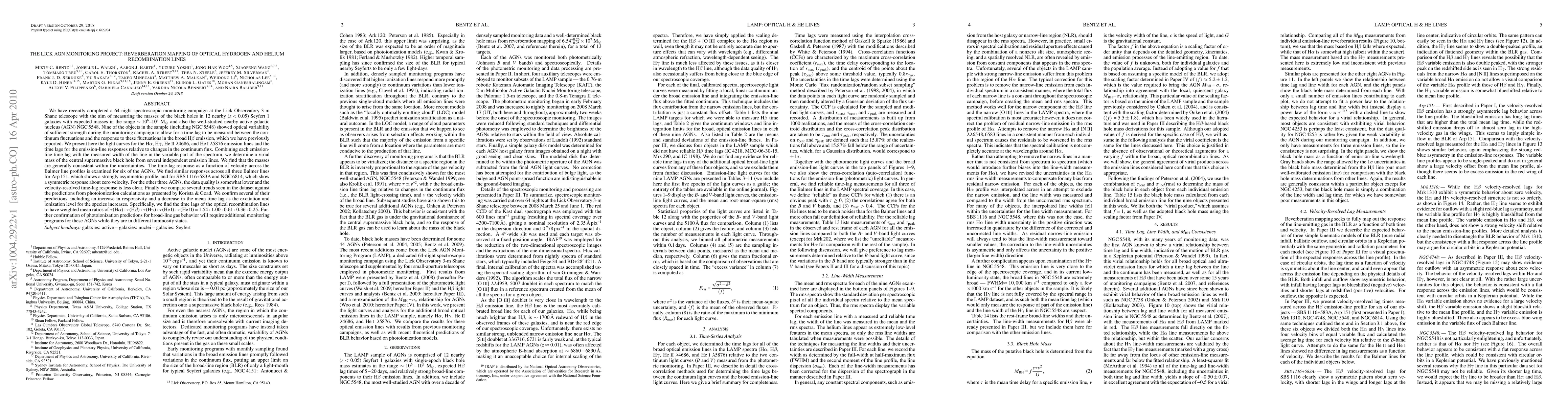 The Lick AGN Monitoring Project conducted a 64-night spectroscopic campaign to measure black hole masses in 12 nearby Seyfert 1 galaxies and NGC 5548, revealing time lags between continuum fluctuations and broad emission lines. The study confirms predictions from photoionization models regarding the response of emission lines to changes in luminosity.