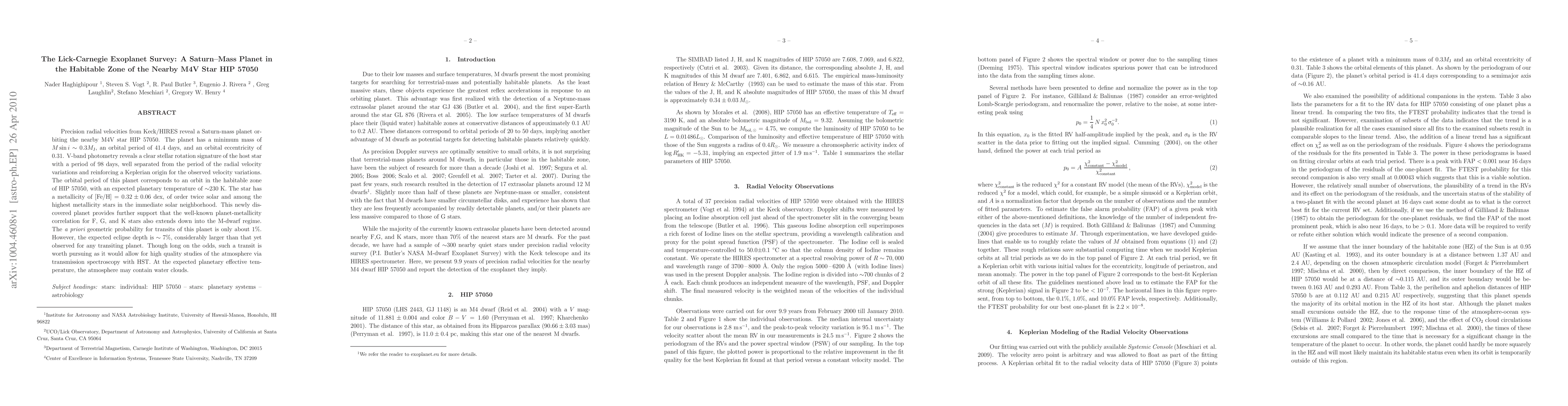 The Lick-Carnegie Exoplanet Survey discovered a Saturn-mass planet orbiting the M4V star HIP 57050 in its habitable zone, with a minimum mass of 0.3 Jupiter-masses and an orbital period of 41.4 days. The star's high metallicity suggests the planet-metallicity correlation extends to M-dwarfs, and while transits are rare, the potential for atmospheric studies via transmission spectroscopy is promising.