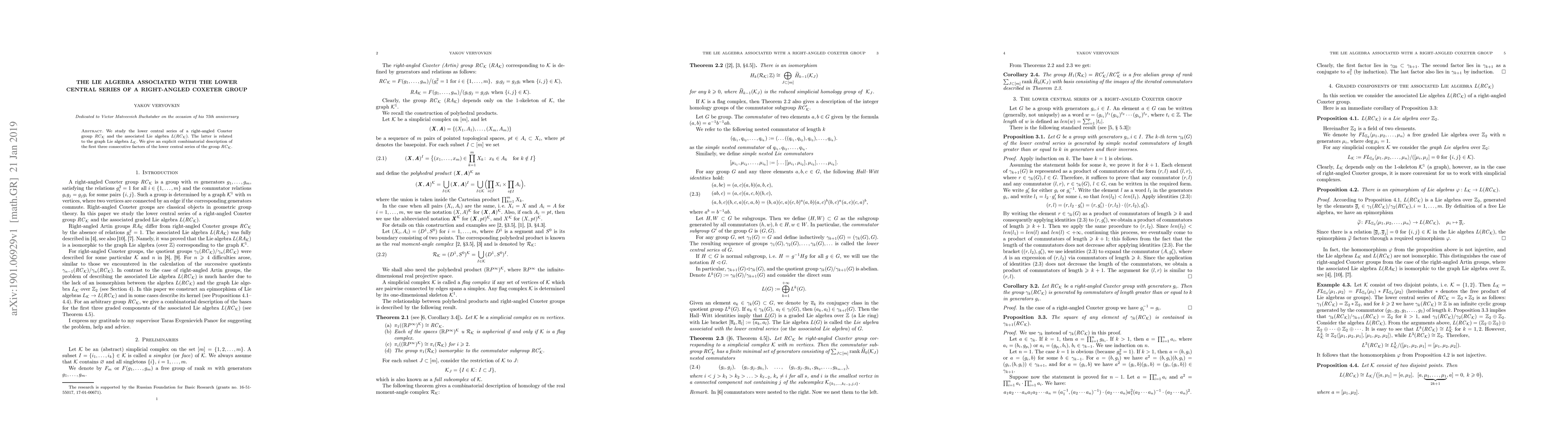 We study the lower central series of a right-angled Coxeter group $RC_K$ and the associated Lie algebra $L(RC_K)$. The latter is related to the graph Lie algebra $L_K$. We give an explicit combinatorial description of the first three consecutive factors of the lower central series of the group $RC_K$.