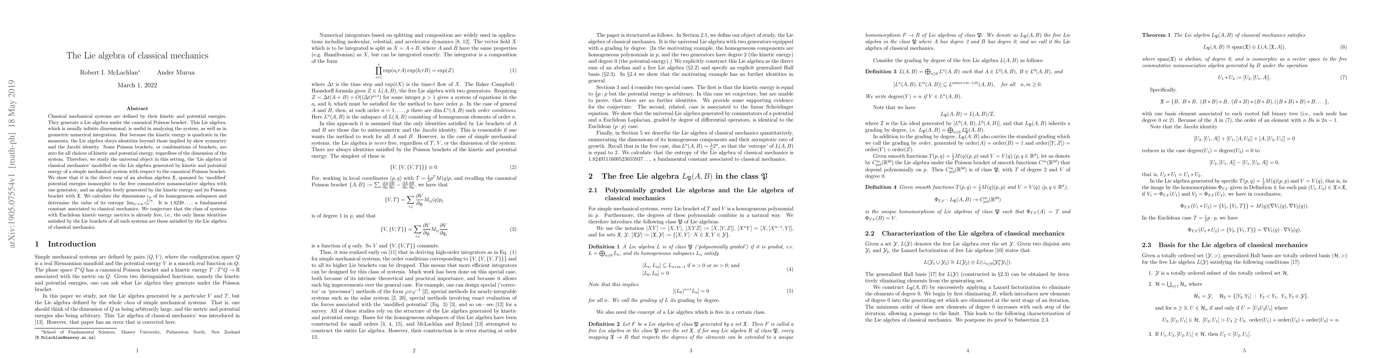 This paper explores the Lie algebra of classical mechanics, revealing it as the direct sum of an abelian algebra and a freely generated algebra, with a calculated entropy value of $1.8249\dots$. It conjectures that systems with Euclidean kinetic energy metrics satisfy only the identities of this universal Lie algebra.
