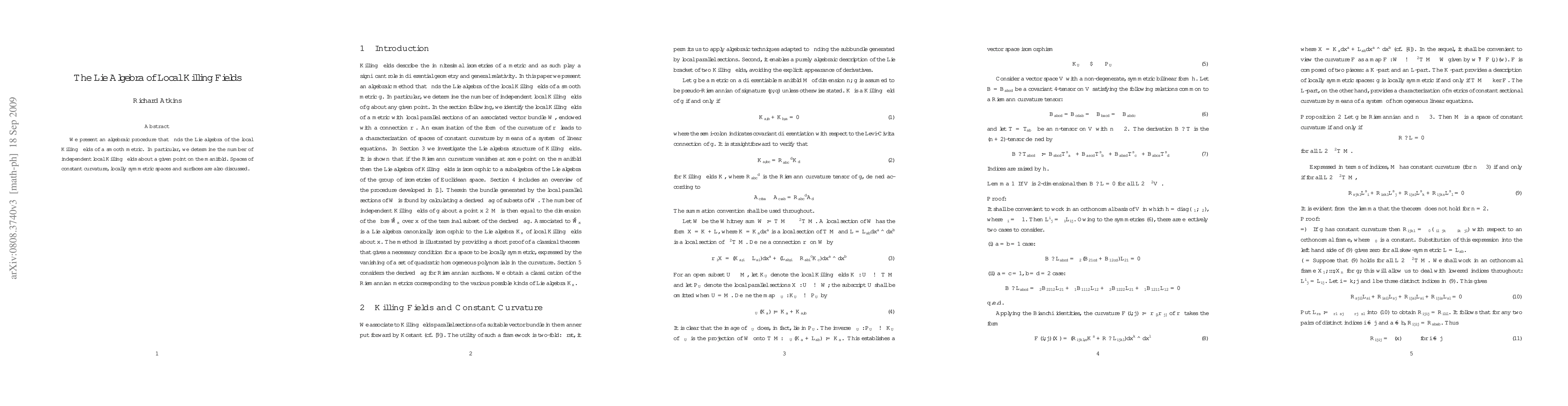 We present an algebraic procedure that finds the Lie algebra of the local Killing fields of a smooth metric. In particular, we determine the number of independent local Killing fields about a given point on the manifold. Spaces of constant curvature and locally symmetric spaces are also discussed. Furthermore, we obtain a complete classification of the Lie algebra of local Killing fields for surfaces in terms of conditions upon the Gauss curvature.