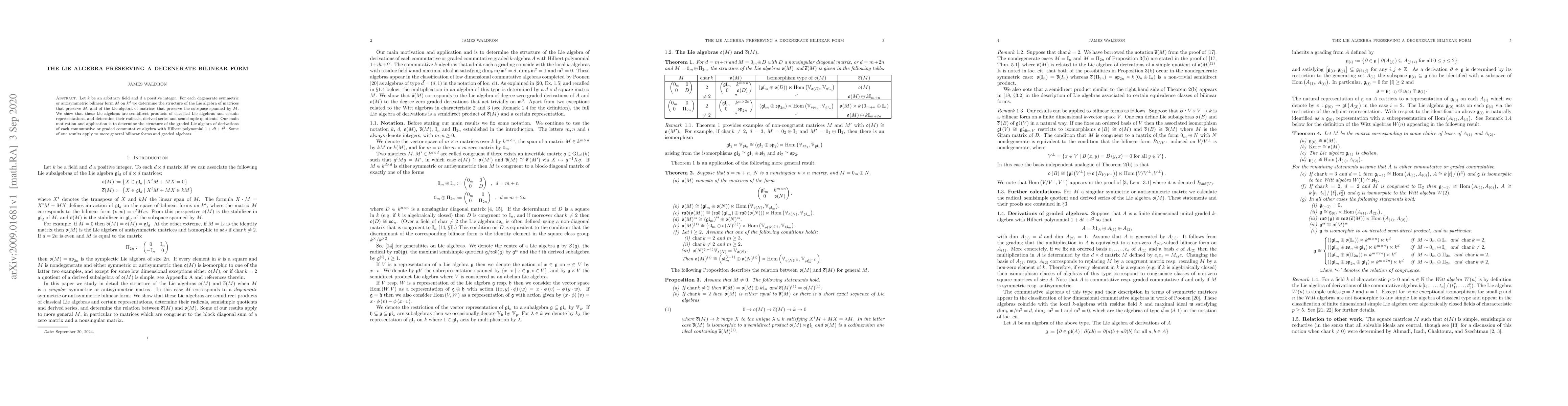 Let $k$ be an arbitrary field and $d$ a positive integer. For each degenerate symmetric or antisymmetric bilinear form $M$ on $k^{d}$ we determine the structure of the Lie algebra of matrices that preserve $M$, and of the Lie algebra of matrices that preserve the subspace spanned by $M$. We show that these Lie algebras are semidirect products of classical Lie algebras and certain representations, and determine their radicals, derived series and semisimple quotients. Our main motivation and application is to determine the structure of the graded Lie algebra of derivations of each commutative or graded commutative algebra with Hilbert polynomial $1+dt+t^{2}$. Some of our results apply to more general bilinear forms and graded algebras.