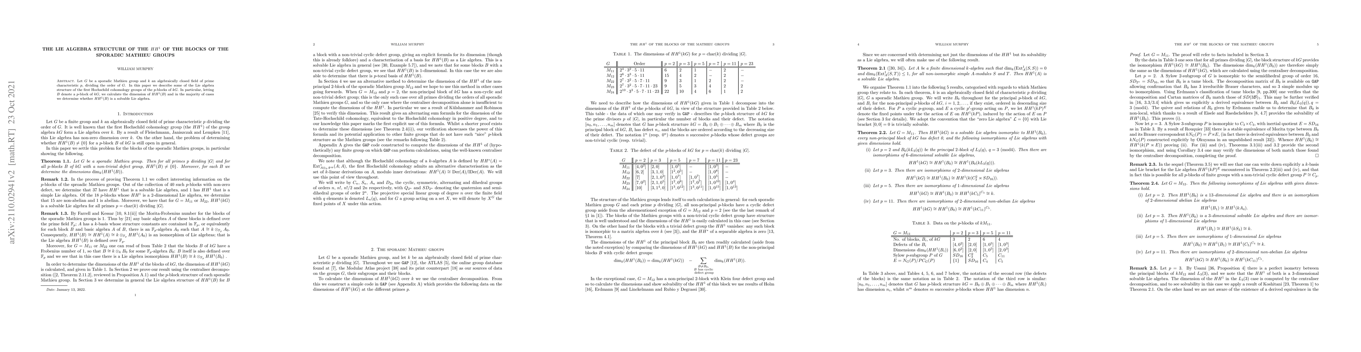 Let $G$ be a sporadic Mathieu group and $k$ an algebraically closed field of prime characteristic $p$, dividing the order of $G$. In this paper we describe some of the Lie algebra structure of the first Hochschild cohomology groups of the $p$-blocks of $kG$. In particular, letting $B$ denote a $p$-block of $kG$, we calculate the dimension of $HH^1(B)$ and in the majority of cases we determine whether $HH^1(B)$ is a solvable Lie algebra.