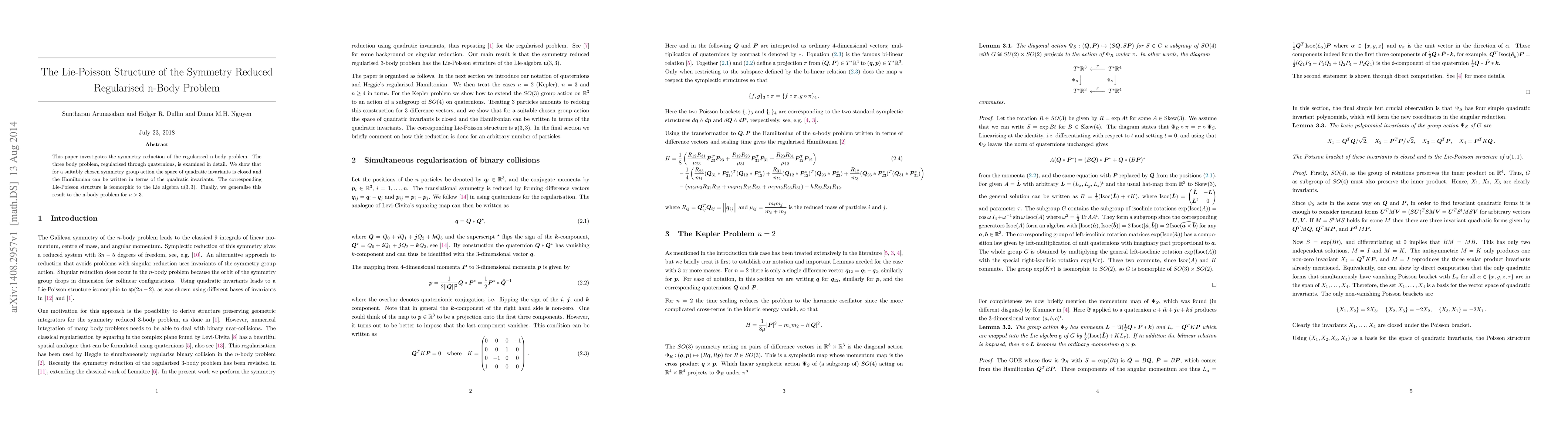 This paper explores the symmetry reduction of the regularised n-body problem, demonstrating that for a specific symmetry group, the Hamiltonian can be expressed in terms of quadratic invariants, revealing a Lie-Poisson structure isomorphic to u(3,3). The findings are extended to n-body problems with n > 3.
