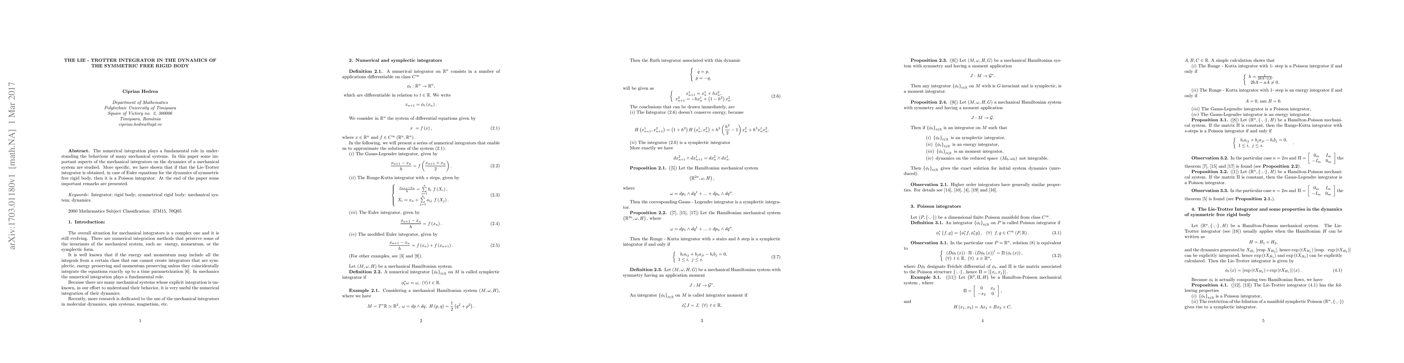 The numerical integration plays a fundamental role in understanding the behaviour of many mechanical systems. In this paper some important aspects of the mechanical integrators on the dynamics of a mechanical system are studied. More specific, we have shown that if that the Lie-Trotter integrator is obtained, in case of Euler equations for the dynamics of symmetric free rigid body, then it is a Poisson integrator. At the end of the paper some important remarks are presented.