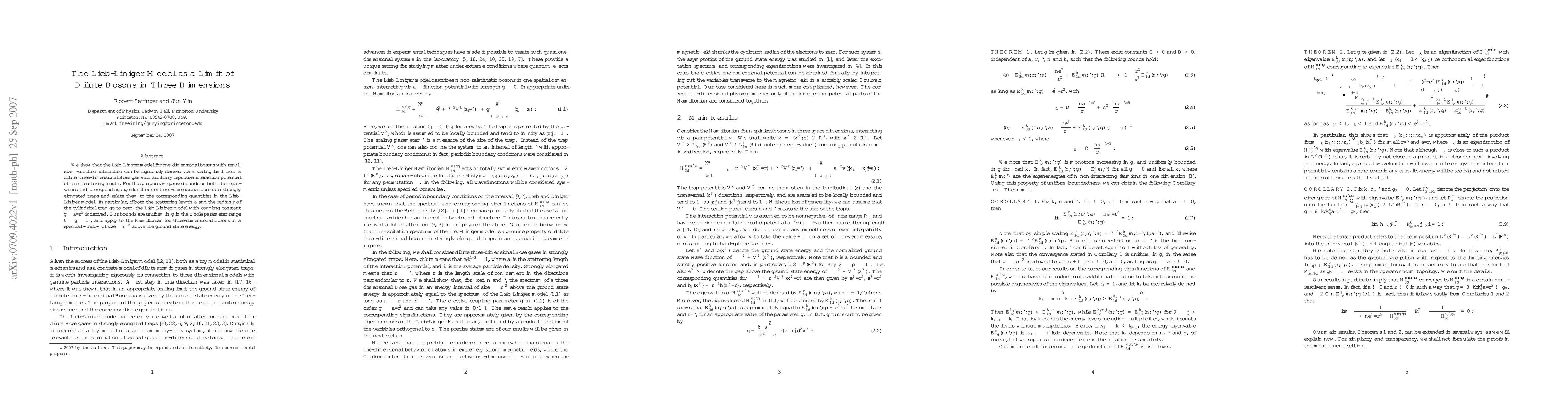 The paper presents a rigorous mathematical derivation of the Lieb-Liniger model from a three-dimensional Bose gas, establishing uniform bounds on eigenvalues and eigenfunctions.