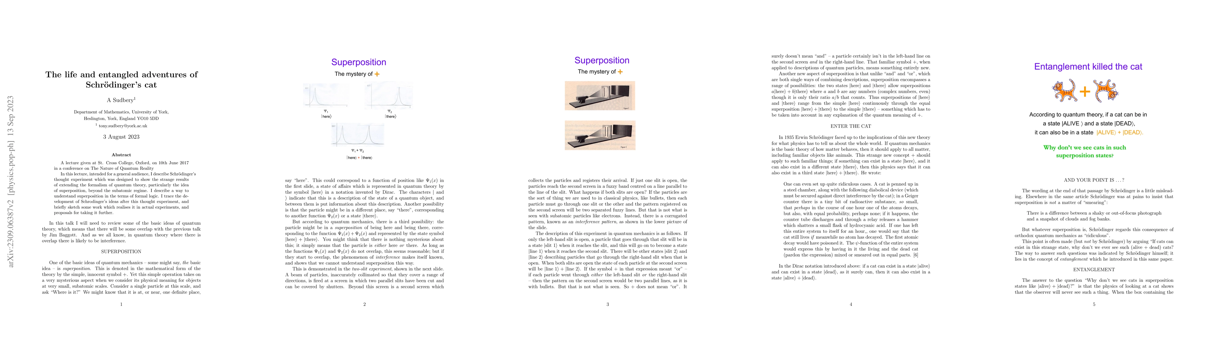 This lecture explains Schrödinger's thought experiment illustrating quantum superposition's strange implications, and proposes a formal logic understanding of superposition. It also traces the evolution of Schrödinger's ideas and highlights experimental realizations and future proposals.
