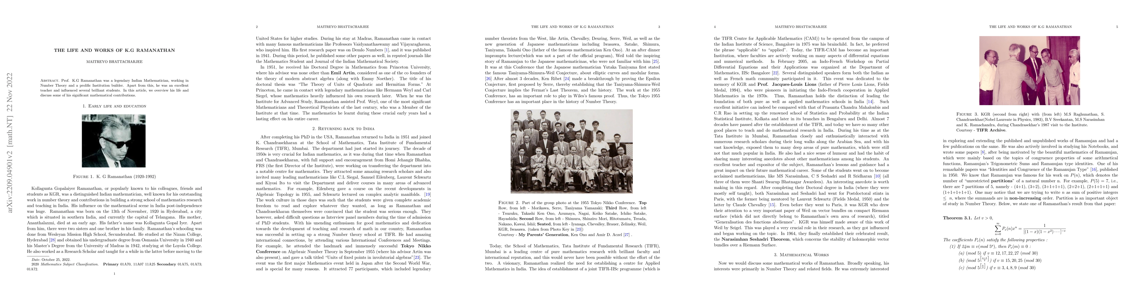 Summary: This paper provides a comprehensive overview of the life and achievements of Prof. K.G Ramanathan, a renowned Indian mathematician known for his contributions to Number Theory and his role as an influential teacher and institution builder. It highlights his significant mathematical works and the impact he had on his students.