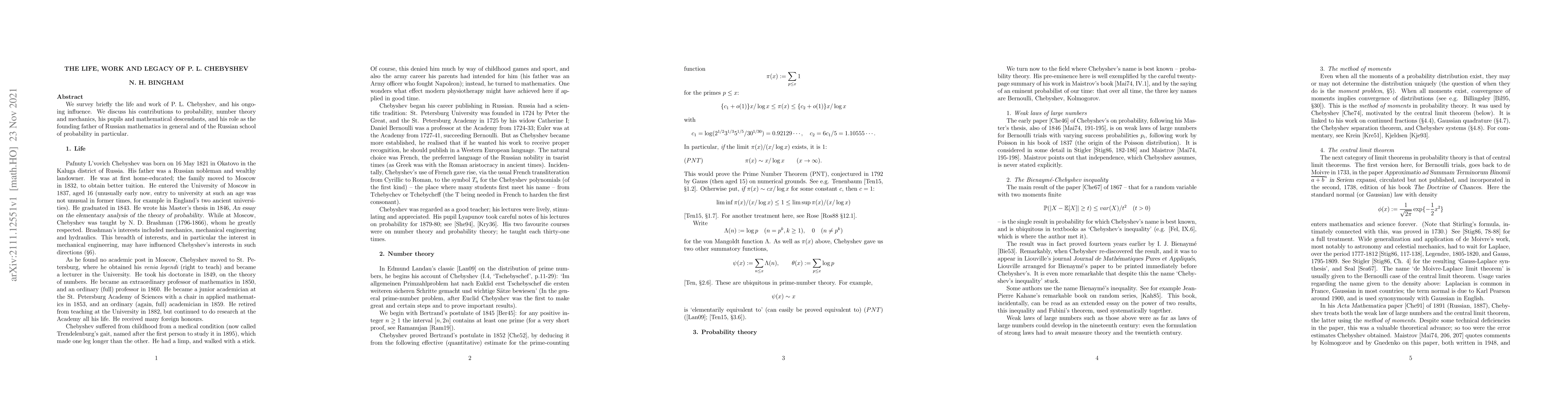 We survey briefly the life and work of P. L. Chebyshev, and his ongoing influence. We discuss his contributions to probability, number theory and mechanics, his pupils and mathematical descendants, and his role as the founding father of Russian mathematics in general and of the Russian school of probability in particular.
