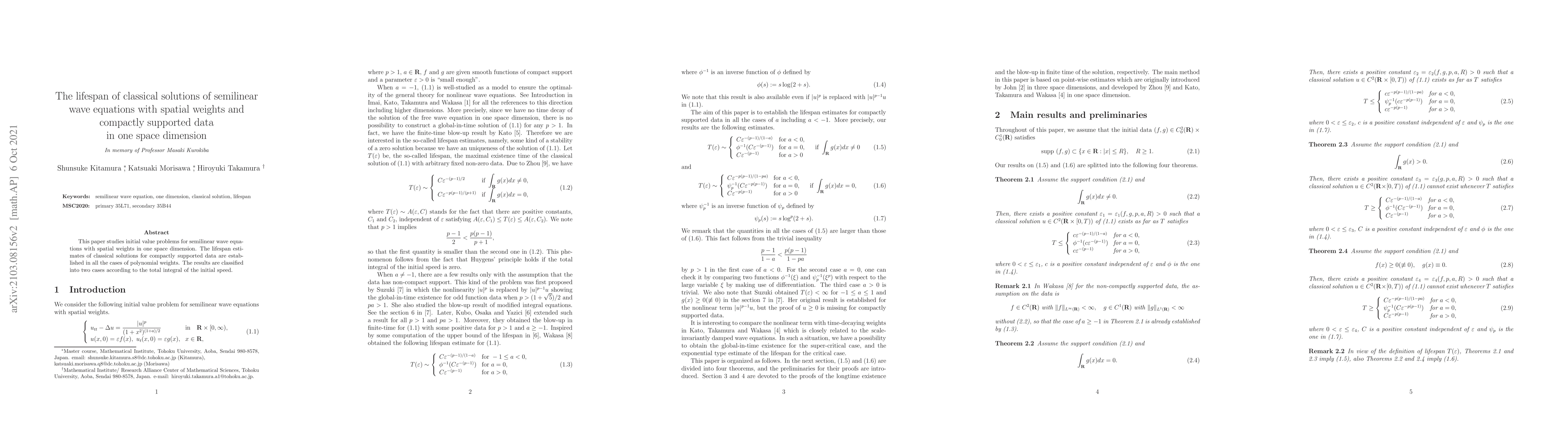 The paper studies semilinear wave equations with spatial weights in 1D, establishing lifespan estimates for classical solutions with compactly supported data. It finds lifespan depends on the total integral of initial speed and polynomial weights.