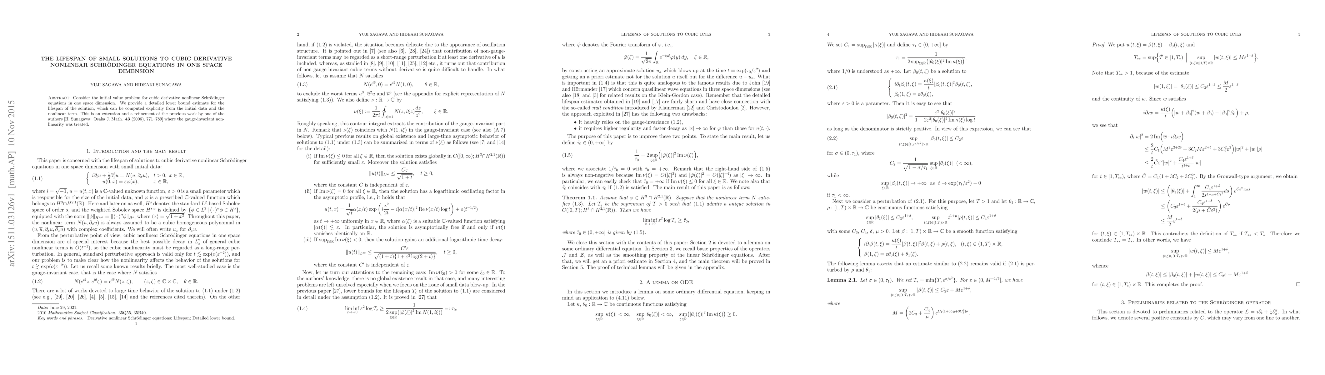 This paper provides a detailed lower bound estimate for the lifespan of small solutions to cubic derivative nonlinear Schrödinger equations in one space dimension, extending and refining previous work on gauge-invariant nonlinearity. The lifespan can be explicitly computed based on the initial data and the nonlinear term.