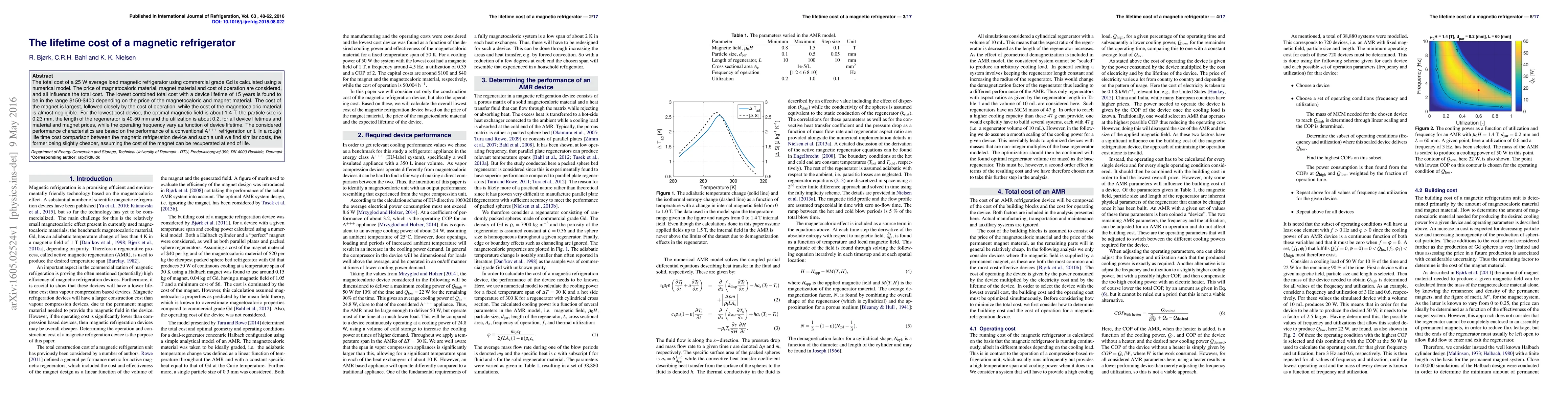 The total cost of a 25 W average load magnetic refrigerator using commercial grade Gd is calculated using a numerical model. The price of magnetocaloric material, magnet material and cost of operation are considered, and all influence the total cost. The lowest combined total cost with a device lifetime of 15 years is found to be in the range \$150-\$400 depending on the price of the magnetocaloric and magnet material. The cost of the magnet is largest, followed closely by the cost of operation, while the cost of the magnetocaloric material is almost negligible. For the lowest cost device, the optimal magnetic field is about 1.4 T, the particle size is 0.23 mm, the length of the regenerator is 40-50 mm and the utilization is about 0.2, for all device lifetimes and material and magnet prices, while the operating frequency vary as function of device lifetime. The considered performance characteristics are based on the performance of a conventional A$^{+++}$ refrigeration unit. In a rough life time cost comparison between the magnetic refrigeration device and such a unit we find similar costs, the former being slightly cheaper, assuming the cost of the magnet can be recuperated at end of life.