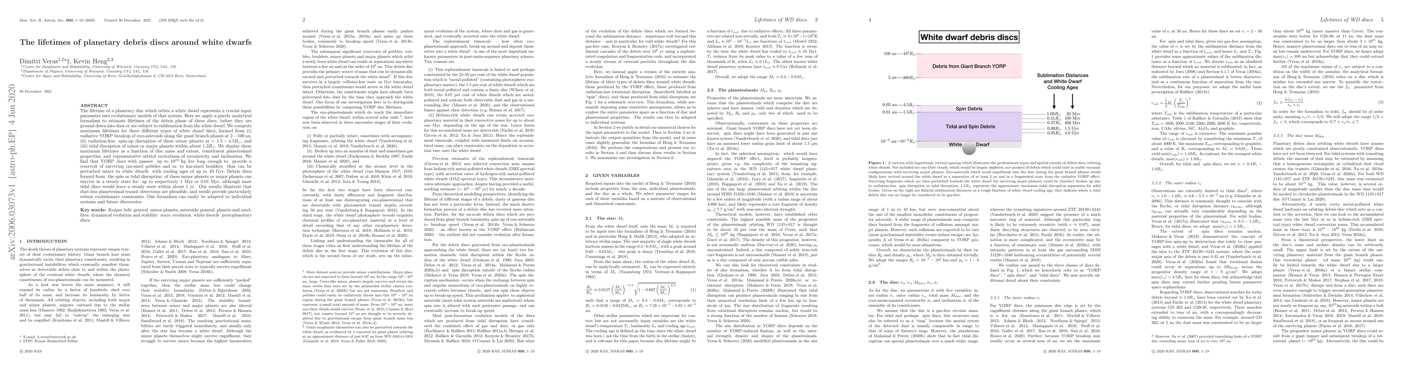 The research analytically computed the maximum steady-state lifetimes of three types of white dwarf debris discs: those composed of debris from giant branch YORP breakup at 2-100 au, radiation-less rotational disruption at 1.5-4.5 R⊙, and tidal disruption within 1.3 R⊙.