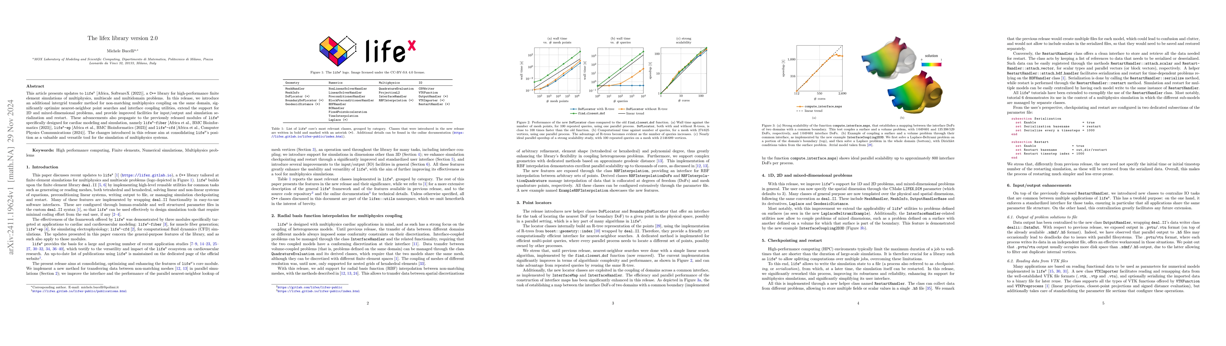 The paper updates lifex library version 2.0, introducing new intergrid transfer methods, optimizing point searches, and enhancing input/output facilities for high-performance finite element simulations. These improvements extend to modules for cardiac modeling and simulation, reinforcing lifex's utility in multiphysics systems.