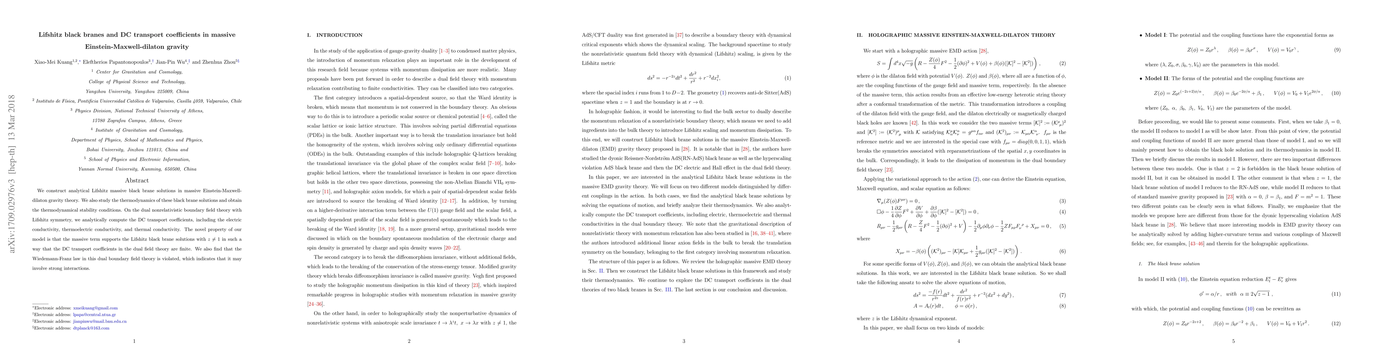 This paper constructs Lifshitz black brane solutions in massive Einstein-Maxwell-dilaton gravity and analyzes their thermodynamic stability, revealing finite DC transport coefficients in the dual nonrelativistic boundary field theory, with the Wiedemann-Franz law violated, suggesting strong interactions.
