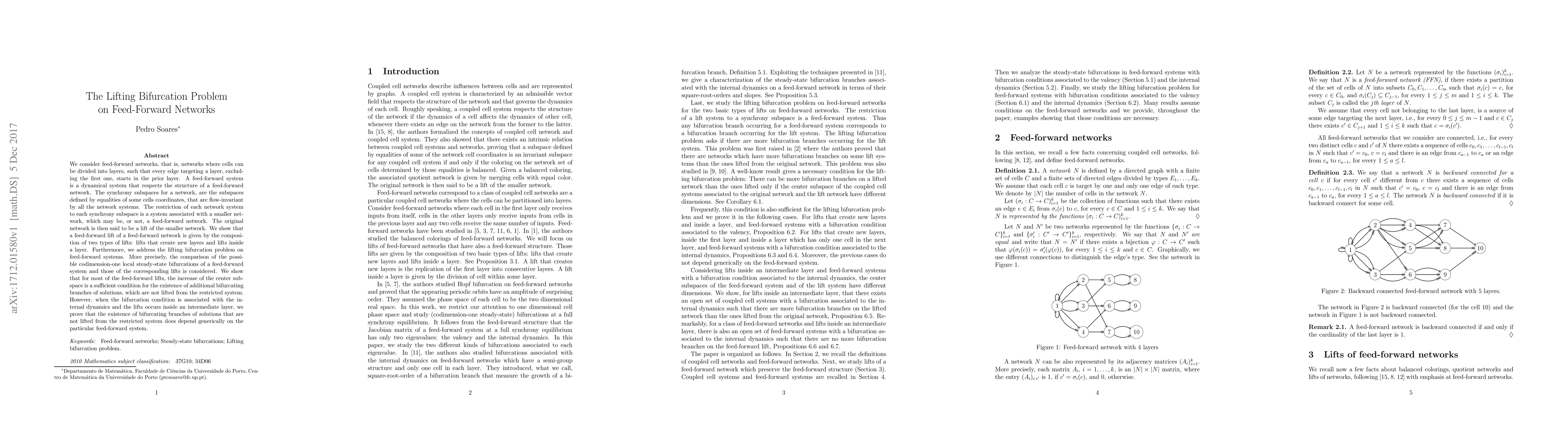 This paper investigates feed-forward neural networks, focusing on their synchrony subspaces and their lifting structure. It demonstrates that a feed-forward network can be decomposed into lifts creating new layers and lifts within layers, and explores the lifting bifurcation problem, showing that increased center subspace often leads to additional bifurcating solution branches, except when bifurcations occur within intermediate layers.