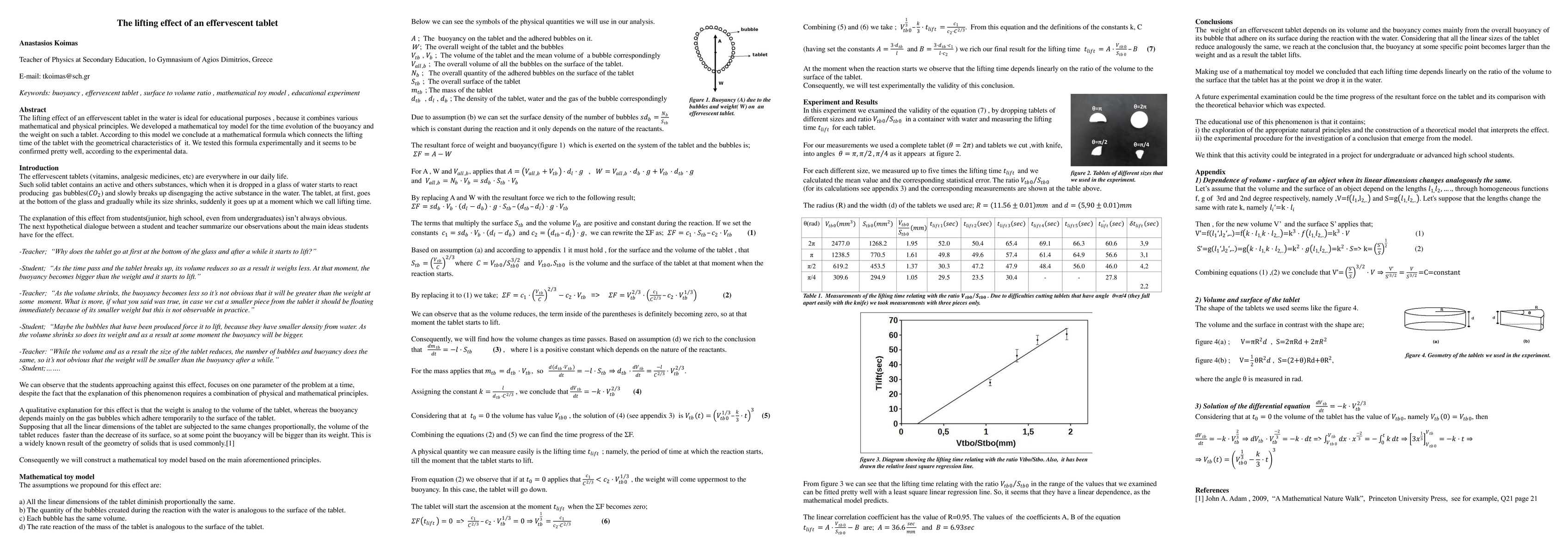 Researchers developed a mathematical model to predict the lifting time of an effervescent tablet in water, and experimental data confirmed the formula's accuracy, making it ideal for educational purposes.