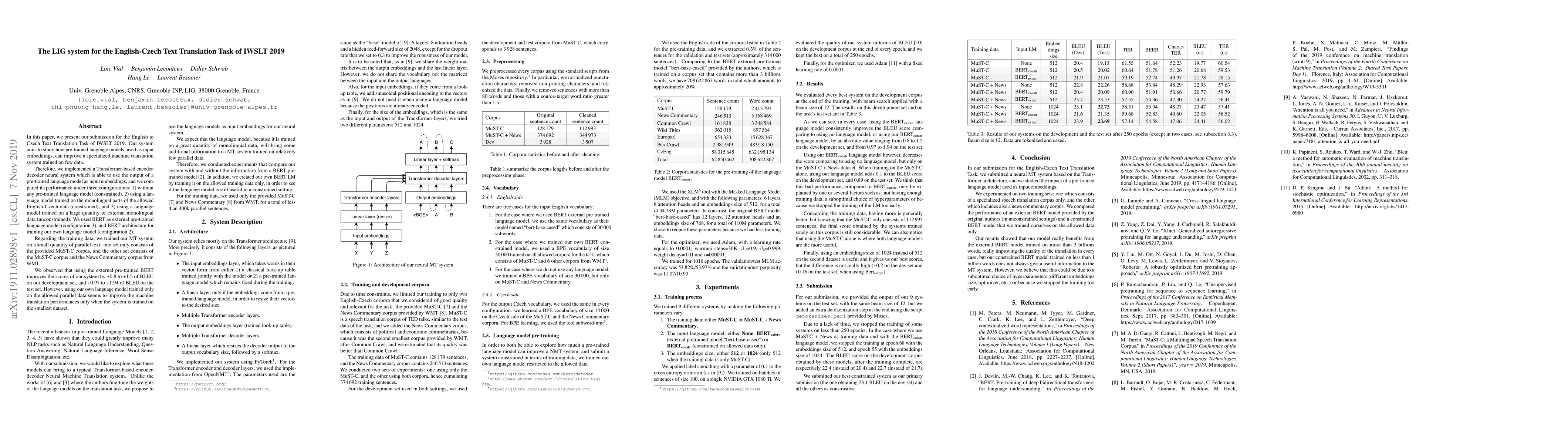 In this paper, we present our submission for the English to Czech Text Translation Task of IWSLT 2019. Our system aims to study how pre-trained language models, used as input embeddings, can improve a specialized machine translation system trained on few data. Therefore, we implemented a Transformer-based encoder-decoder neural system which is able to use the output of a pre-trained language model as input embeddings, and we compared its performance under three configurations: 1) without any pre-trained language model (constrained), 2) using a language model trained on the monolingual parts of the allowed English-Czech data (constrained), and 3) using a language model trained on a large quantity of external monolingual data (unconstrained). We used BERT as external pre-trained language model (configuration 3), and BERT architecture for training our own language model (configuration 2). Regarding the training data, we trained our MT system on a small quantity of parallel text: one set only consists of the provided MuST-C corpus, and the other set consists of the MuST-C corpus and the News Commentary corpus from WMT. We observed that using the external pre-trained BERT improves the scores of our system by +0.8 to +1.5 of BLEU on our development set, and +0.97 to +1.94 of BLEU on the test set. However, using our own language model trained only on the allowed parallel data seems to improve the machine translation performances only when the system is trained on the smallest dataset.