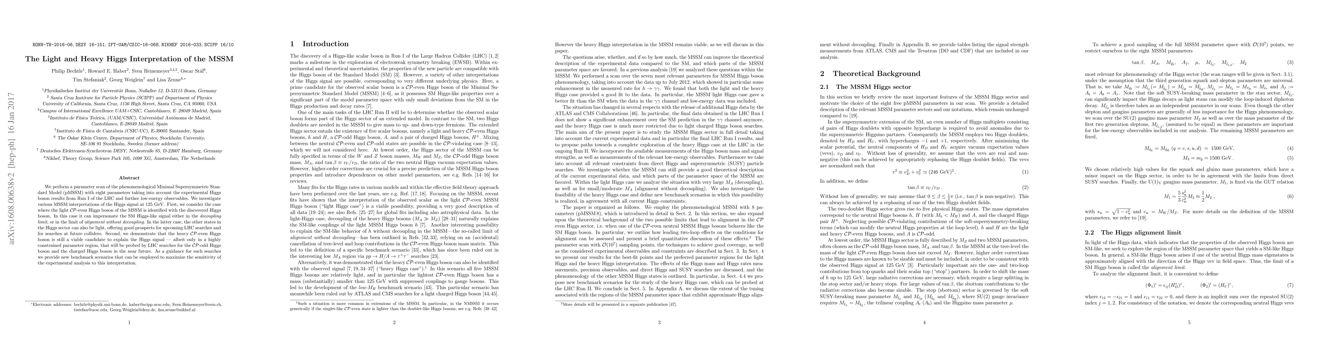This paper explores the Minimal Supersymmetric Standard Model (MSSM) with a parameter scan, considering experimental results from the LHC and low-energy observables. It examines two interpretations of the 125 GeV Higgs signal: one where the light CP-even Higgs matches the discovered boson, and another where the heavy CP-even Higgs is the candidate, providing benchmark scenarios for future collider searches.