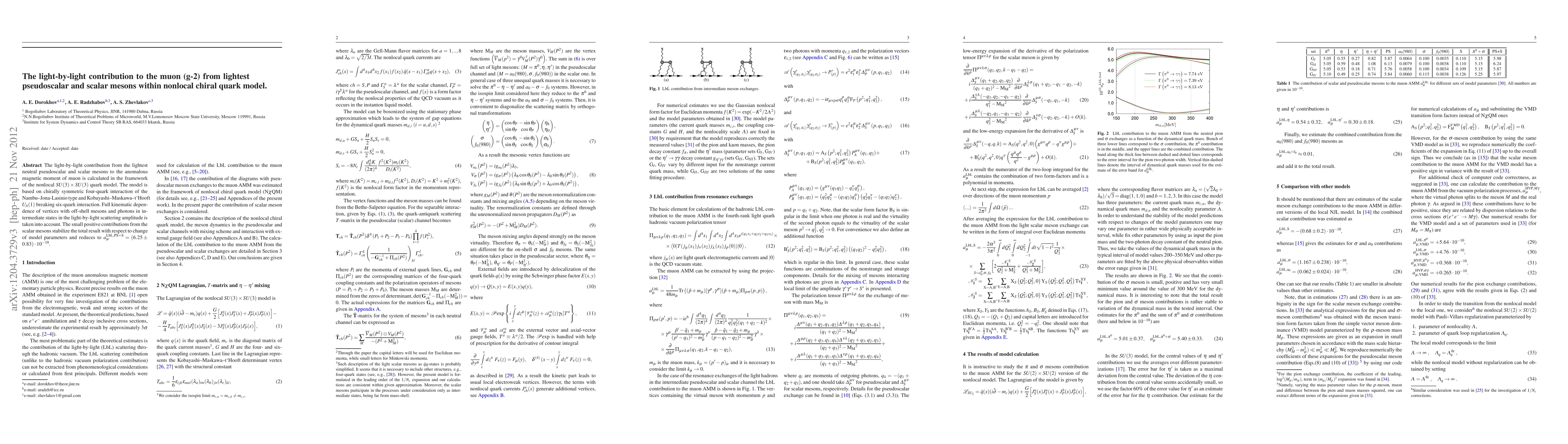 This paper calculates the light-by-light contribution to the muon's anomalous magnetic moment from the lightest pseudoscalar and scalar mesons using a nonlocal chiral quark model. The result, incorporating full kinematic dependence, yields a small positive contribution of \(a_\mu^{LbL,PS+S}=(6.25\pm 0.83)x10^{-10}\).