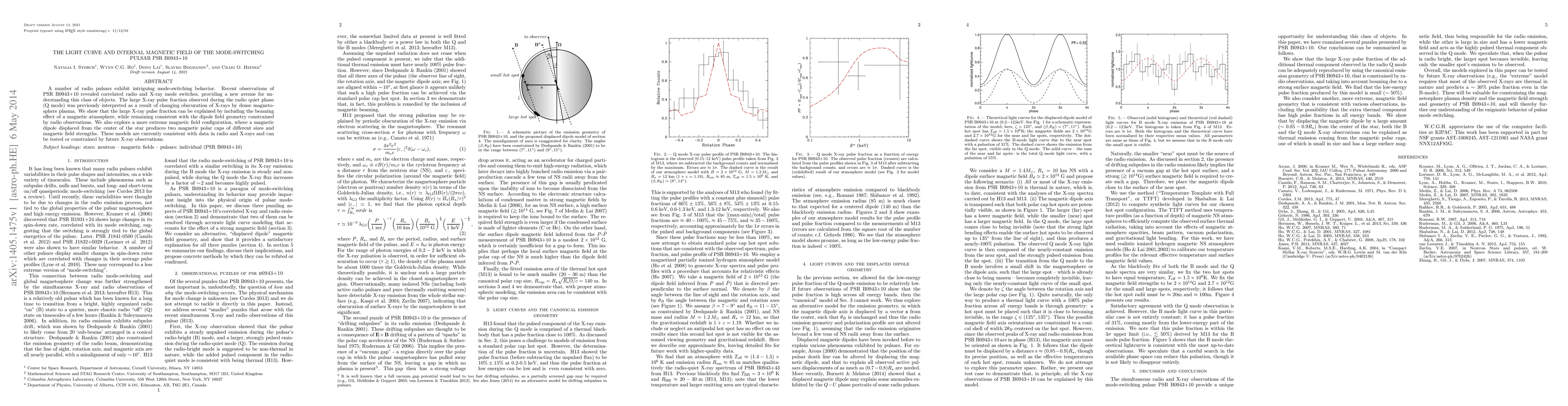 This paper investigates the mode-switching behavior of the pulsar PSR B0943+10, explaining its large X-ray pulse fraction during the radio quiet phase through a magnetic atmosphere model. It proposes a displaced magnetic dipole configuration to account for differing polar cap sizes and strengths, offering a consistent framework with current radio and X-ray data.