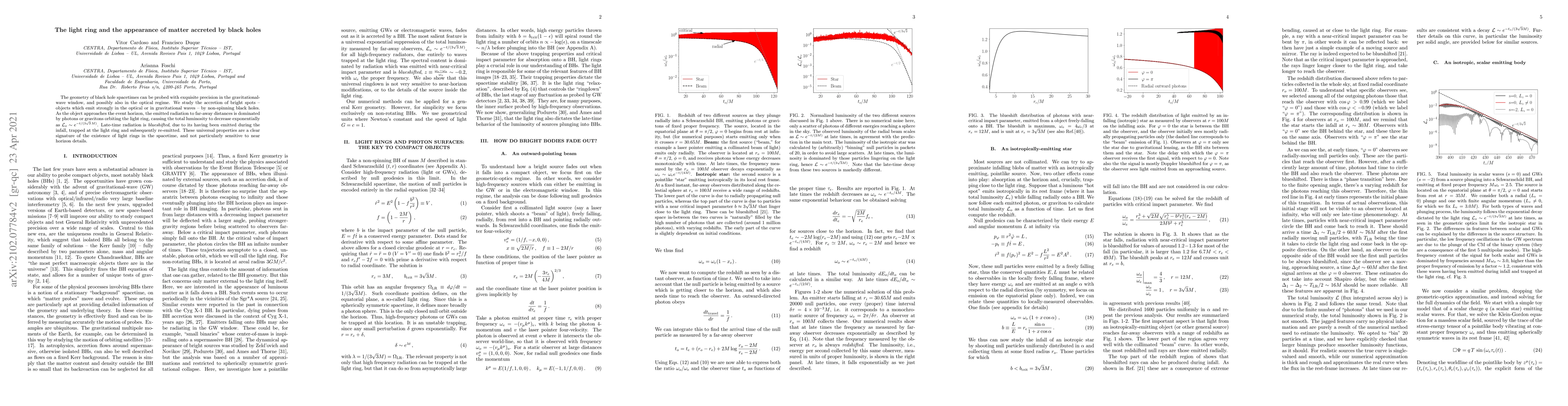 The geometry of black hole spacetimes can be probed with exquisite precision in the gravitational-wave window, and possibly also in the optical regime. We study the accretion of bright spots -- objects which emit strongly in the optical or in gravitational waves -- by non-spinning black holes. The emission as the object falls down the hole is dominated by photons or gravitons orbiting the light ring, causing the total luminosity to decrease exponentially as ${\cal L}_o\sim e^{-t/(3\sqrt{3}\,M)}$. Late-time radiation is blueshifted, due to its having been emitted during the infall, trapped at the light ring and subsequently re-emitted. These universal properties are a clear signature of the existence of light rings in the spacetime, and not particularly sensitive to near horizon details.