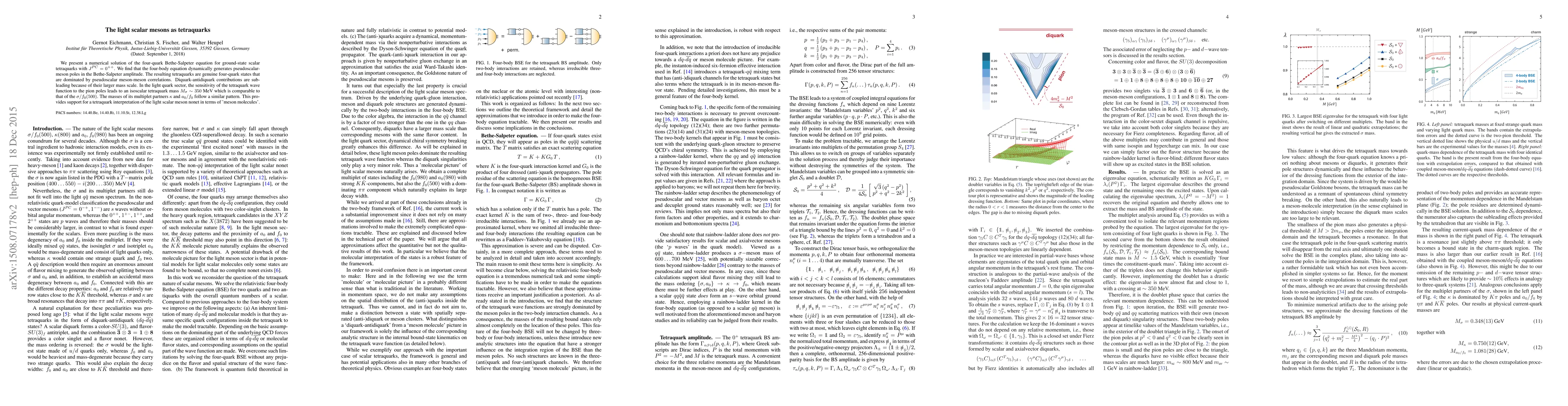 We present a numerical solution of the four-quark Bethe-Salpeter equation for ground-state scalar tetraquarks with J^PC = 0^++. We find that the four-body equation dynamically generates pseudoscalar-meson poles in the Bethe-Salpeter amplitude. The resulting tetraquarks are genuine four-quark states that are dominated by pseudoscalar meson-meson correlations. Diquark-antidiquark contributions are subleading because of their larger mass scale. In the light quark sector, the sensitivity of the tetraquark wave function to the pion poles leads to an isoscalar tetraquark mass M_sigma ~ 350 MeV which is comparable to that of the sigma/f0(500). The masses of its multiplet partners kappa and a0/f0 follow a similar pattern. This provides support for a tetraquark interpretation of the light scalar meson nonet in terms of 'meson molecules'.