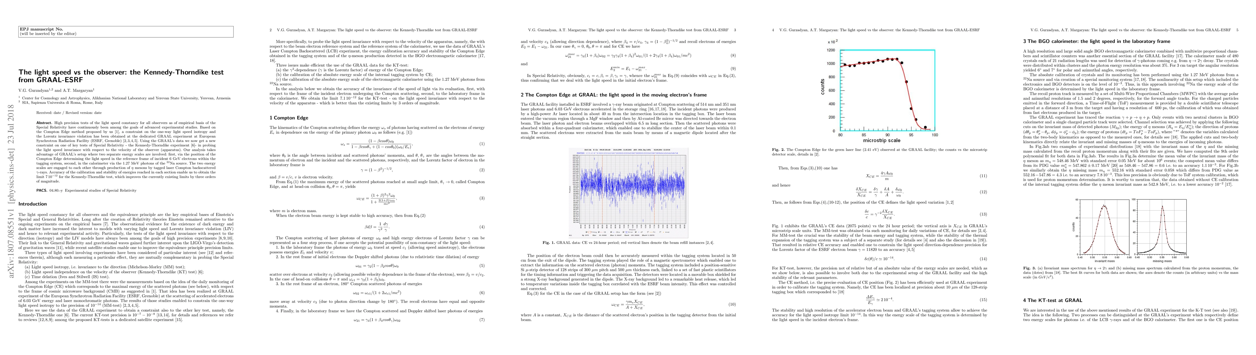 This paper reports high-precision results from the GRAAL experiment at ESRF, achieving a new constraint on the Kennedy-Thorndike test, which examines the constancy of light speed relative to the observer's velocity. The study employs the Compton Edge method to improve the existing limits on light speed isotropy and Lorentz invariance violation by three orders of magnitude, reaching a limit of 7 x 10^-12.