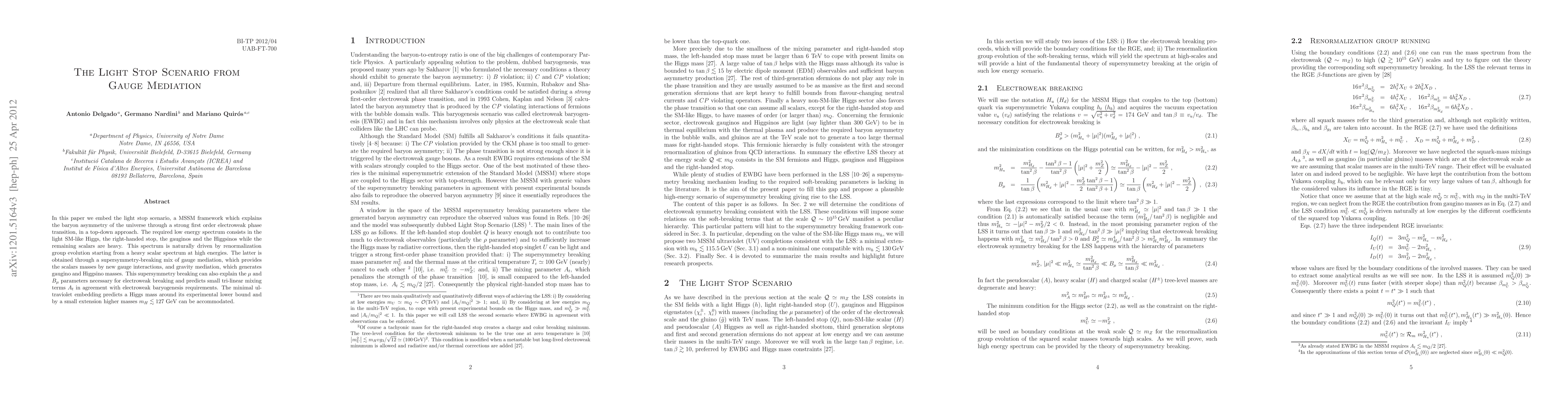 This paper explores the light stop scenario within the MSSM framework, explaining the universe's baryon asymmetry through a strong first-order electroweak phase transition. It combines gauge and gravity mediation for a low energy spectrum featuring a light SM-like Higgs, right-handed stop, gauginos, and Higgsinos, while the remaining scalars are heavy, with the minimal embedding predicting a Higgs mass near its experimental lower bound.