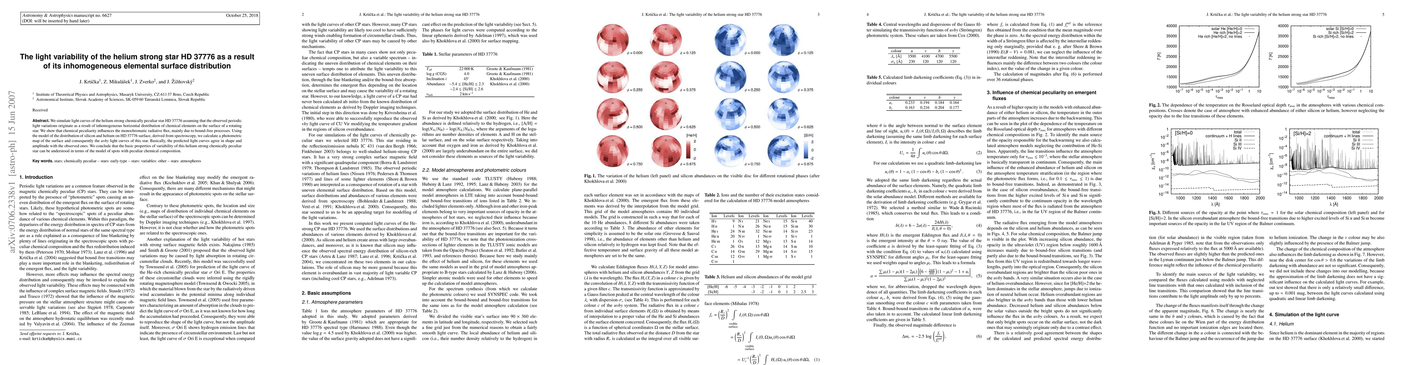 This paper investigates the light variability of the helium strong star HD 37776, attributing it to an inhomogeneous elemental surface distribution. The study models the light curves based on spectroscopic data, showing that the star's variability is influenced by bound-free processes due to the uneven distribution of silicon and helium, and finds good agreement between predicted and observed light curves.