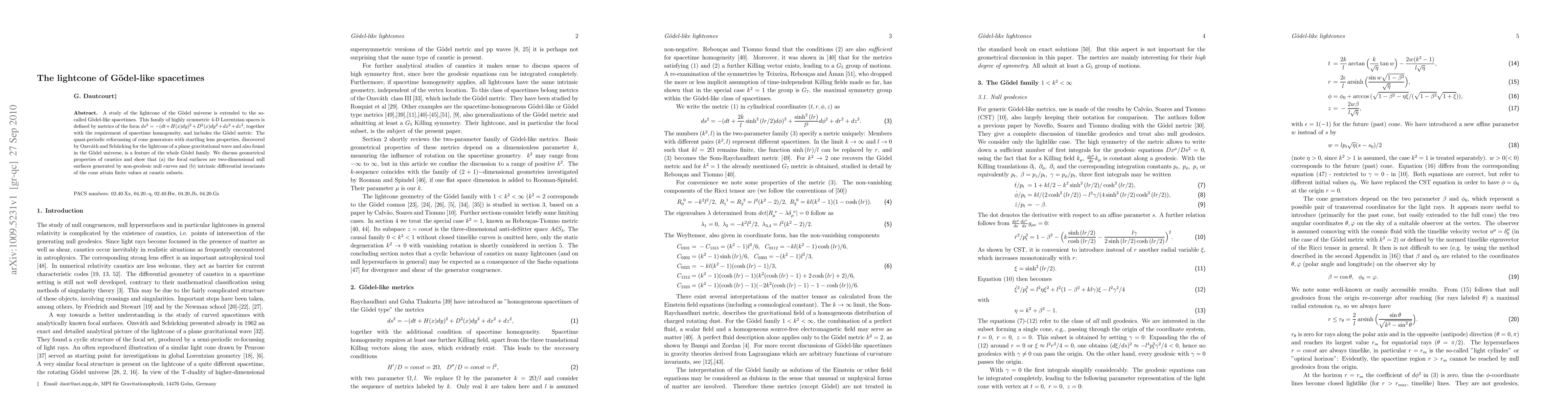 A study of the lightcone of the G\"odel universe is extended to the so-called G\"odel-like spacetimes. This family of highly symmetric 4-D Lorentzian spaces is defined by metrics of the form $ds^2=-(dt+H(x)dy)^2+D^2(x)dy^2+dx^2+dz^2$, together with the requirement of spacetime homogeneity, and includes the G\"odel metric. The quasi-periodic refocussing of cone generators with startling lens properties, discovered by Ozsv\'{a}th and Sch\"ucking for the lightcone of a plane gravitational wave and also found in the G\"odel universe, is a feature of the whole G\"odel family. We discuss geometrical properties of caustics and show that (a) the focal surfaces are two-dimensional null surfaces generated by non-geodesic null curves and (b) intrinsic differential invariants of the cone attain finite values at caustic subsets.