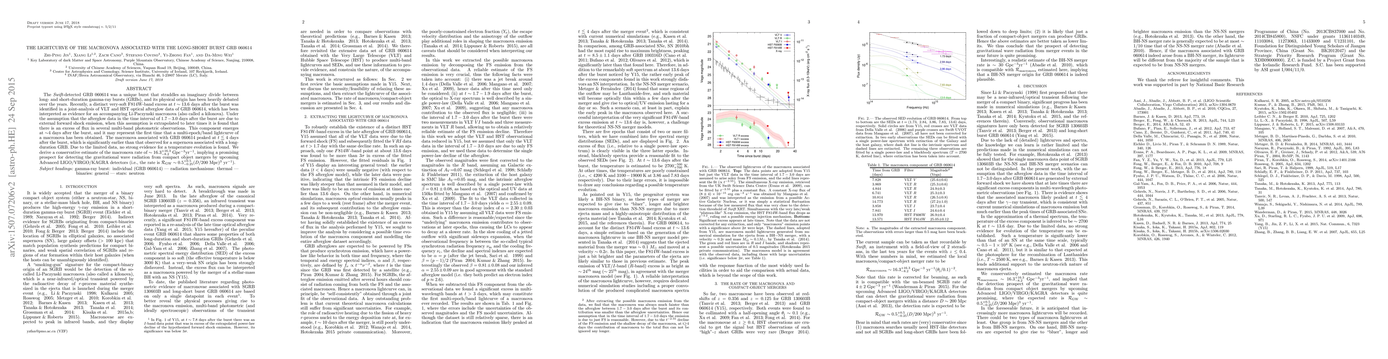 The {\it Swift}-detected GRB 060614 was a unique burst that straddles an imaginary divide between long- and short-duration gamma-ray bursts (GRBs), and its physical origin has been heavily debated over the years. Recently, a distinct very-soft F814W-band excess at $t\sim 13.6$ days after the burst was identified in a joint-analysis of VLT and HST optical afterglow data of GRB~060614, which has been interpreted as evidence for an accompanying Li-Paczynski macronova (also called a kilonova). Under the assumption that the afterglow data in the time interval of $1.7-3.0$ days after the burst are due to external forward shock emission, when this assumption is extrapolated to later times it is found that there is an excess of flux in several multi-band photometric observations. This component emerges at $\sim$4 days after the burst, and it may represent the first time that a multi-epoch/band lightcurve of a macronova has been obtained. The macronova associated with GRB 060614 peaked at $t\lesssim 4$ days after the burst, which is significantly earlier than that observed for a supernova associated with a long-duration GRB. Due to the limited data, no strong evidence for a temperature evolution is found. We derive a conservative estimate of the macronova rate of $\sim 16.3^{+16.3}_{-8.2}~{\rm Gpc^{-3}}{\rm yr^{-1}}$, implying a promising prospect for detecting the gravitational wave radiation from compact object mergers by upcoming Advanced LIGO/VIRGO/KAGRA detectors (i.e., the rate is ${\cal R}_{\rm GW} \sim 0.5^{+0.5}_{-0.25}(D/200~{\rm Mpc})^{3}~{\rm yr^{-1}}$).
