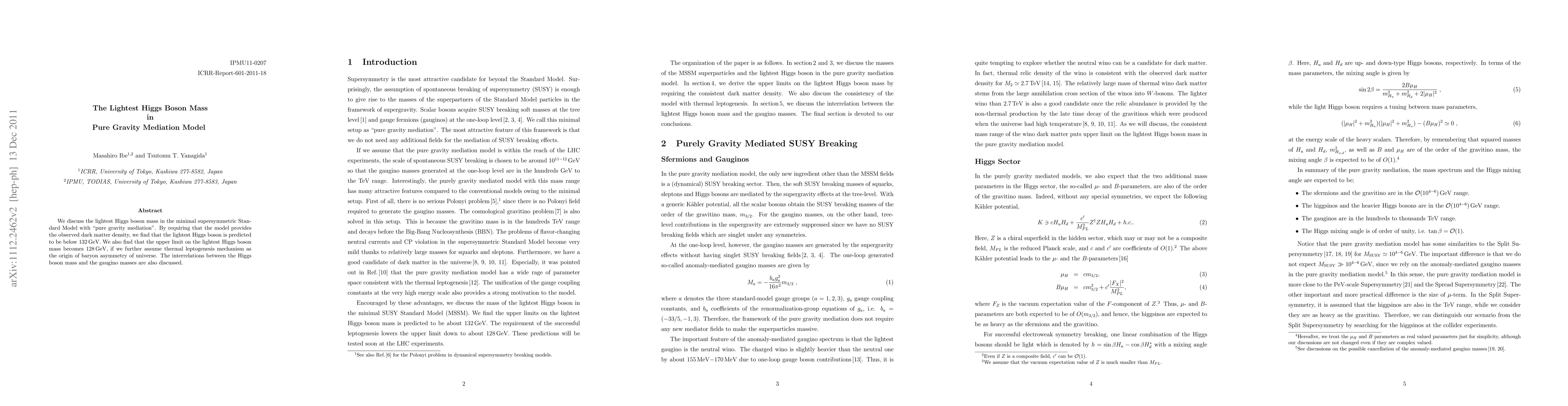 This paper investigates the lightest Higgs boson mass in the minimal supersymmetric Standard Model under pure gravity mediation, finding it to be below 132 GeV. It also concludes that the upper limit can be 128 GeV if thermal leptogenesis is the origin of the universe's baryon asymmetry, while discussing the connections between the Higgs mass and gaugino masses.