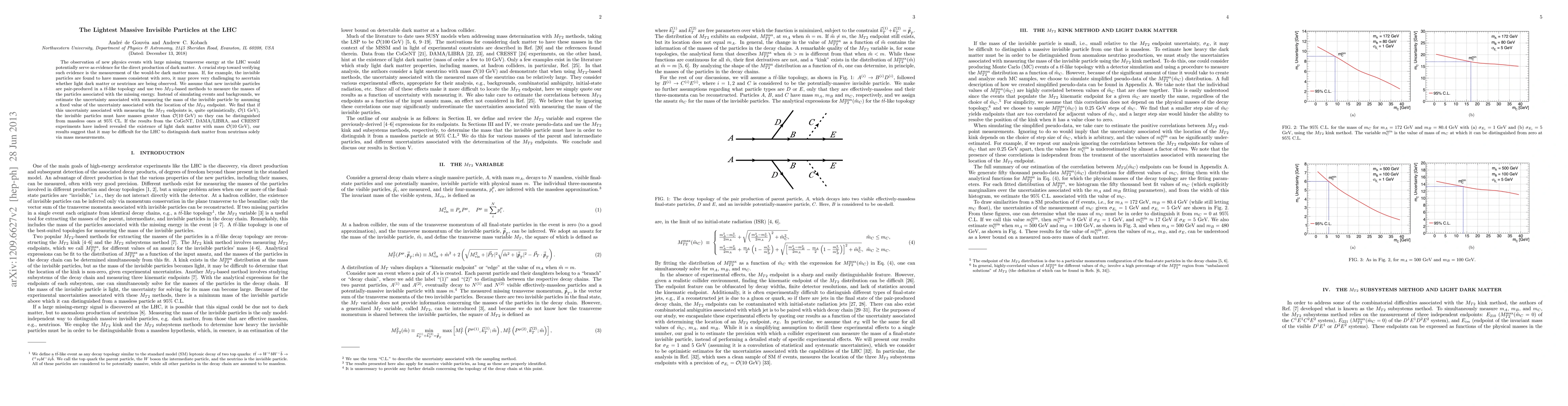 The observation of new physics events with large missing transverse energy at the LHC would potentially serve as evidence for the direct production of dark matter. A crucial step toward verifying such evidence is the measurement of the would-be dark matter mass. If, for example, the invisible particles are found to have masses consistent with zero, it may prove very challenging to ascertain whether light dark matter or neutrinos are being observed. We assume that new invisible particles are pair-produced in a ttbar-like topology and use two MT2-based methods to measure the masses of the particles associated with the missing energy. Instead of simulating events and backgrounds, we estimate the uncertainty associated with measuring the mass of the invisible particle by assuming a fixed value of the uncertainty associated with the location of the MT2 endpoint. We find that if this uncertainty associated with measuring the MT2 endpoints is, quite optimistically, O(1 GeV), the invisible particles must have masses greater than O(10 GeV) so they can be distinguished from massless ones at 95% CL. If the results from the CoGeNT, DAMA/LIBRA, and CRESST experiments have indeed revealed the existence of light dark matter with mass O(10 GeV), our results suggest that it may be difficult for the LHC to distinguish dark matter from neutrinos solely via mass measurements.