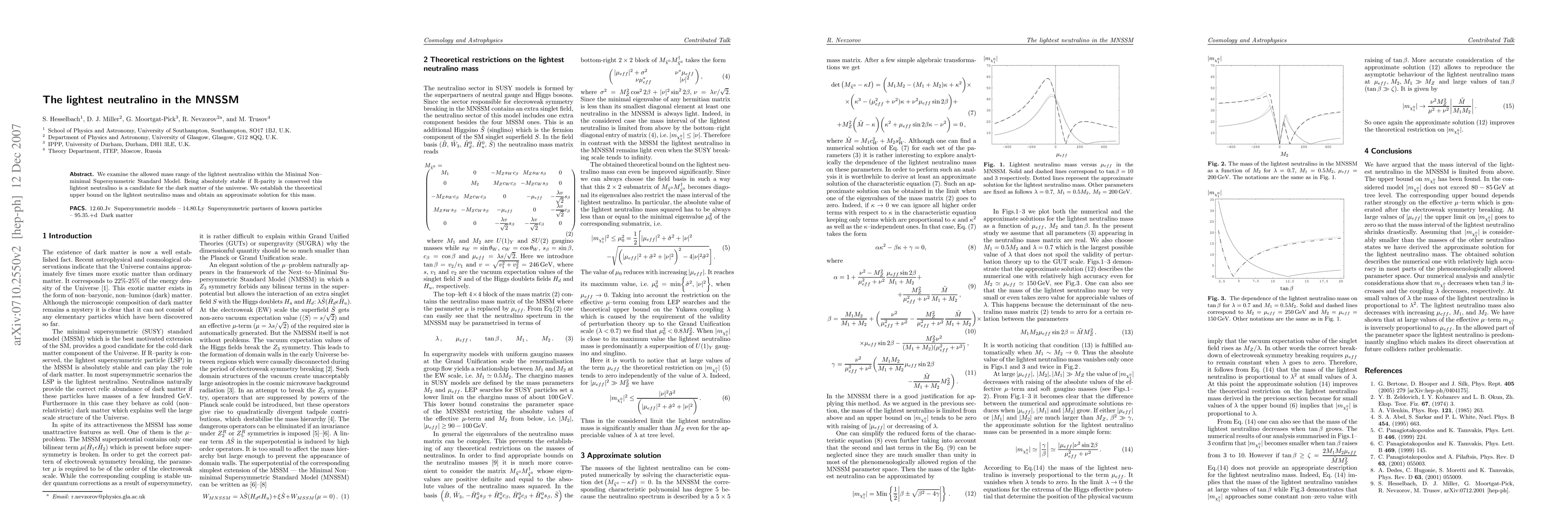 This paper investigates the mass range of the lightest neutralino in the Minimal Non-minimal Supersymmetric Standard Model (MNSSM) and determines its theoretical upper bound. If R-parity is conserved, this lightest neutralino, being absolutely stable, is a viable candidate for dark matter.