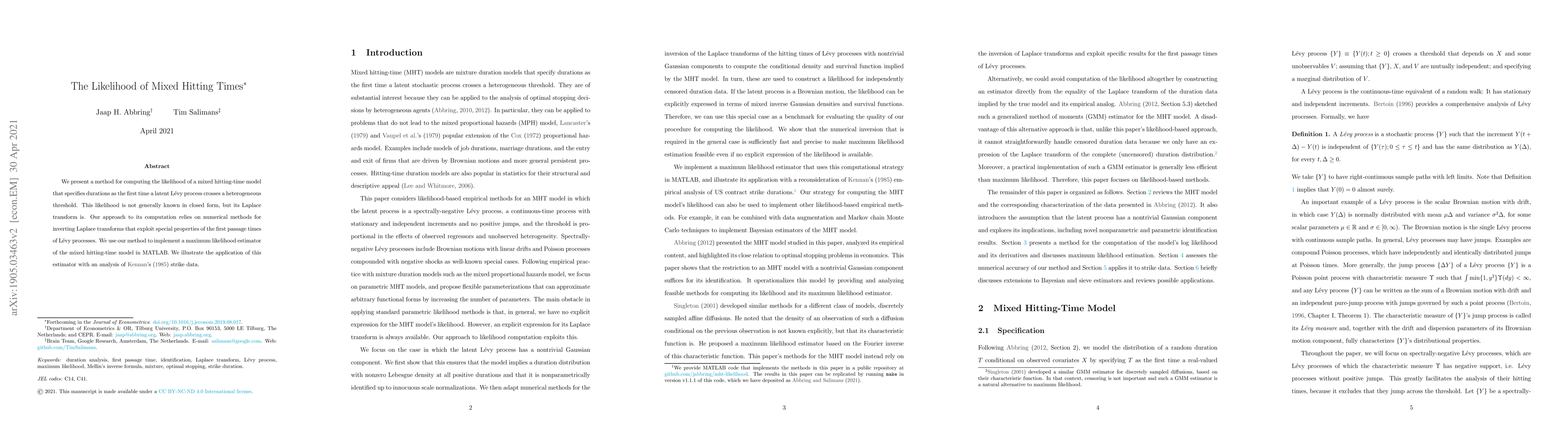 We present a method for computing the likelihood of a mixed hitting-time model that specifies durations as the first time a latent L\'evy process crosses a heterogeneous threshold. This likelihood is not generally known in closed form, but its Laplace transform is. Our approach to its computation relies on numerical methods for inverting Laplace transforms that exploit special properties of the first passage times of L\'evy processes. We use our method to implement a maximum likelihood estimator of the mixed hitting-time model in MATLAB. We illustrate the application of this estimator with an analysis of Kennan's (1985) strike data.