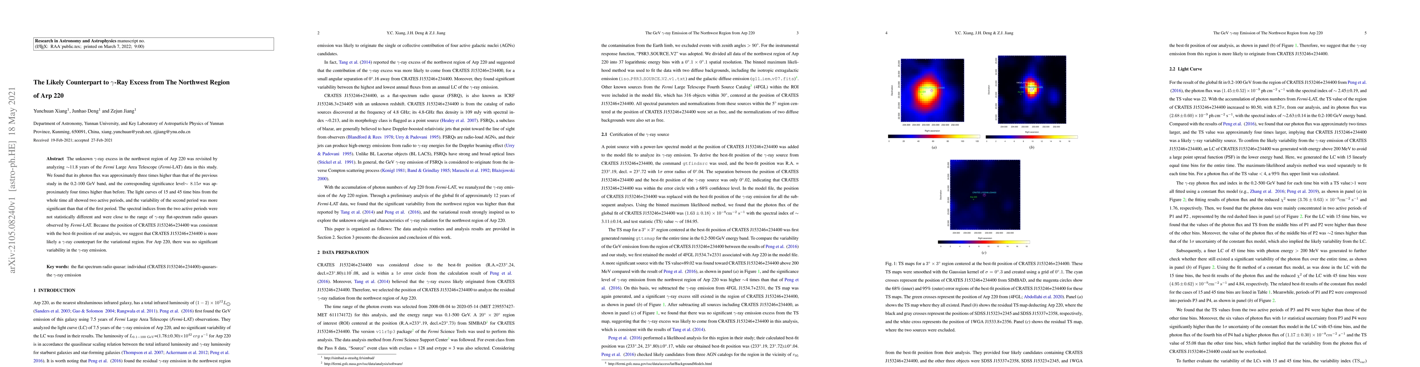 The unknown $\gamma$-ray excess in the northwest region of Arp 220 was revisited by analyzing $\sim$11.8 years of the \textit{Fermi} Large Area Telescope (\textit{Fermi}-LAT) data in this study. We found that its photon flux was approximately three times higher than that of the previous study in the 0.2-100 GeV band, and the corresponding significance level$\sim8.15\sigma$ was approximately four times higher than before. The light curves of 15 and 45 time bins from the whole time all showed two active periods, and the variability of the second period was more significant than that of the first period. The spectral indices from the two active periods were not statistically different and were close to the range of $\gamma$-ray flat-spectrum radio quasars observed by \textit{Fermi}-LAT. Because the position of CRATES J153246+234400 was consistent with the best-fit position of our analysis, we suggest that CRATES J153246+234400 is more likely a $\gamma$-ray counterpart for the variational region. For Arp 220, there was no significant variability in the $\gamma$-ray emission.