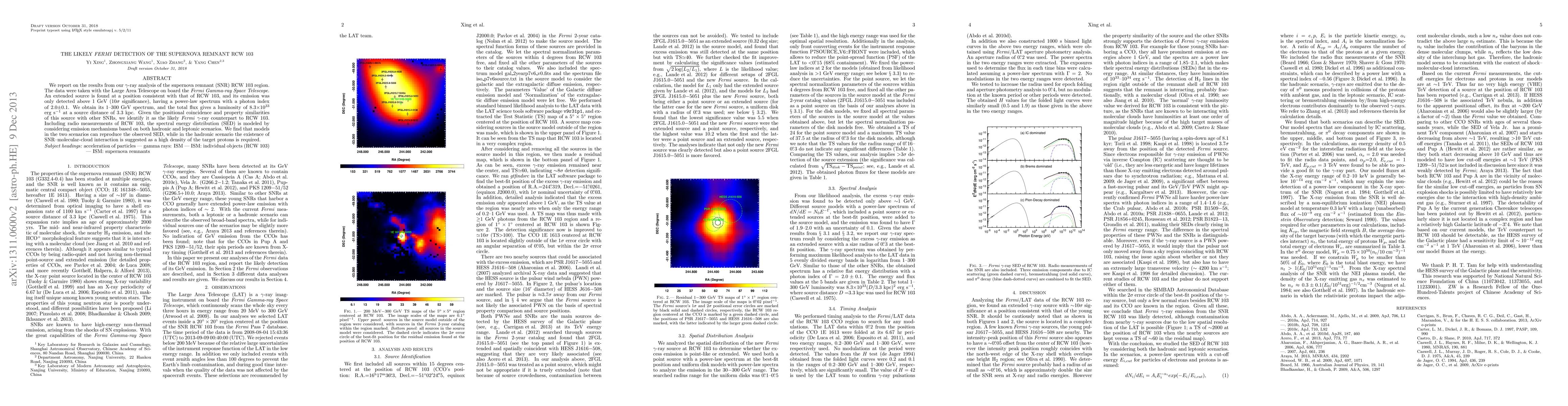 The Fermi Gamma-ray Space Telescope detected an extended gamma-ray source above 1 GeV in the RCW 103 supernova remnant region, suggesting it as the likely Fermi counterpart. The source's spectrum fits a power-law model, and its luminosity is estimated at 8.3×10^33 erg s^-1, with both hadronic and leptonic models explaining the observed spectral energy distribution.