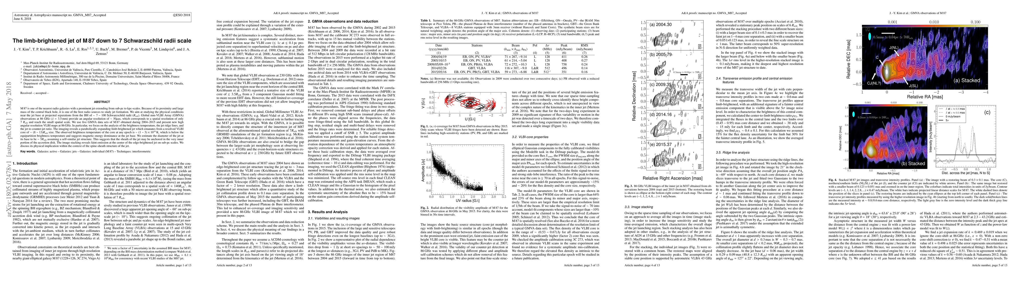 M87 is one of the nearest radio galaxies with a prominent jet extending from sub-pc to kpc-scales. Because of its proximity and large mass of the central black hole, it is one of the best radio sources to study jet formation. We aim at studying the physical conditions near the jet base at projected separations from the BH of $\sim7-100$ Schwarzschild radii ($R_{\rm sch}$). Global mm-VLBI Array (GMVA) observations at 86 GHz ($\lambda=3.5\,$mm) provide an angular resolution of $\sim50\mu$as, which corresponds to a spatial resolution of only $7~R_{\rm sch}$ and reach the small spatial scale. We use five GMVA data sets of M87 obtained during 2004--2015 and present new high angular resolution VLBI maps at 86GHz. In particular, we focus on the analysis of the brightness temperature, the jet ridge lines, and the jet to counter-jet ratio. The imaging reveals a parabolically expanding limb-brightened jet which emanates from a resolved VLBI core of $\sim(8-13) R_{\rm sch}$ size. The observed brightness temperature of the core at any epoch is $\sim(1-3)\times10^{10}\,$K, which is below the equipartition brightness temperature and suggests magnetic energy dominance at the jet base. We estimate the diameter of the jet at its base to be $\sim5 R_{\rm sch}$ assuming a self-similar jet structure. This suggests that the sheath of the jet may be anchored in the very inner portion of the accretion disk. The image stacking reveals faint emission at the center of the edge-brightened jet on sub-pc scales. We discuss its physical implication within the context of the spine-sheath structure of the jet.