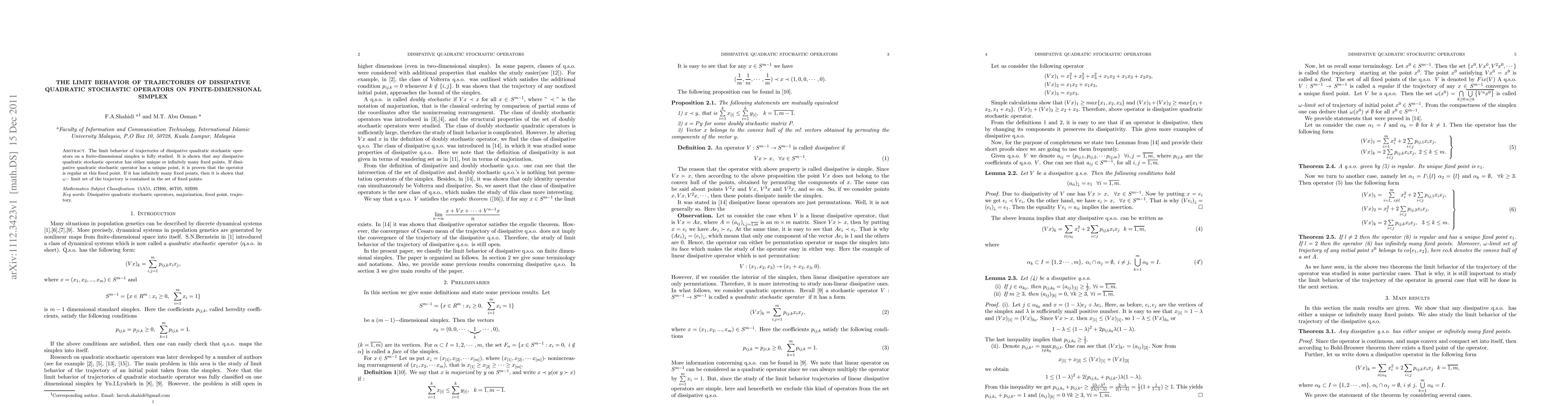 Summary: This paper investigates the limit behavior of trajectories under dissipative quadratic stochastic operators on a finite-dimensional simplex, revealing that such operators either have a unique or infinitely many fixed points, with the latter case showing that the ω-limit set of trajectories is contained within the set of fixed points.