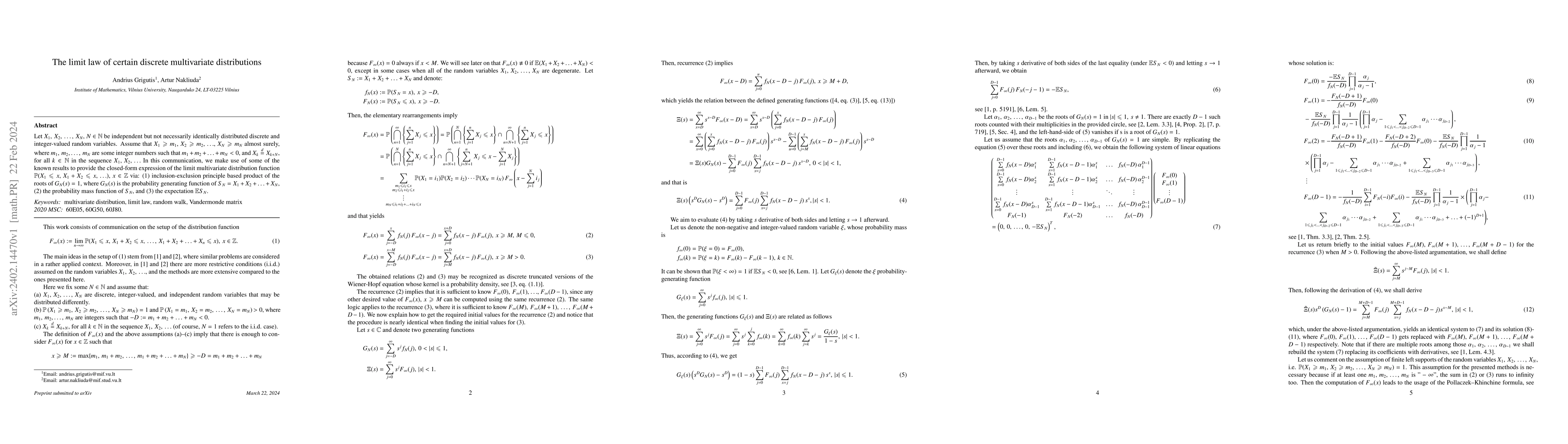 Let $X_1,\,X_2,\,\ldots,\,X_N$, $N\in\mathbb{N}$ be independent but not necessarily identically distributed discrete and integer-valued random variables. Assume that $X_1\geqslant m_1$, $X_2\geqslant m_2$, $\ldots$, $X_N\geqslant m_N$ almost surely, where $m_1,\,m_2,\ldots,\,m_N$ are some integer numbers such that $m_1+m_2+\ldots+m_N<0$, and $X_k$ is identically distributed as $X_{k+N}$, for all $k\in\mathbb{N}$ in the sequence $X_1,\,X_2,\,\ldots$ In this communication, we make use of some of the known results to provide the closed-form expression of the limit multivariate distribution function $\mathbb{P}(X_1\leqslant x,\,X_1+X_2\leqslant x,\,\ldots)$, $x\in\mathbb{Z}$ via: (1) inclusion-exclusion principle based product of the roots of $G_{N}(s)=1$, where $G_{N}(s)$ is the probability generating function of $S_N=X_1+X_2+\ldots+X_N$, (2) the probability mass function of $S_N$, and (3) the expectation $\mathbb{E}S_N$.