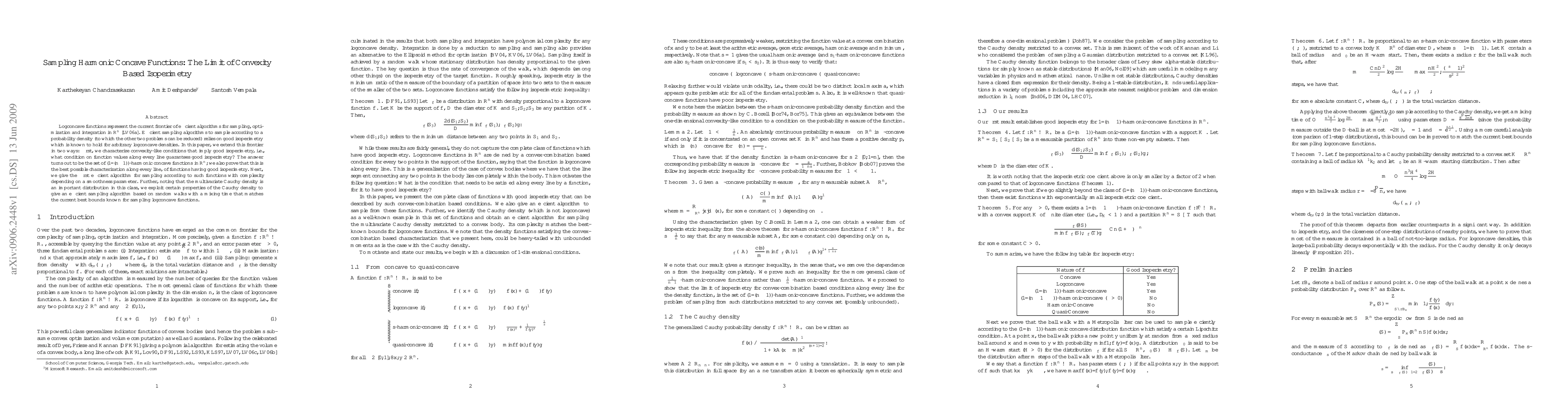 Logconcave functions represent the current frontier of efficient algorithms for sampling, optimization and integration in R^n. Efficient sampling algorithms to sample according to a probability density (to which the other two problems can be reduced) relies on good isoperimetry which is known to hold for arbitrary logconcave densities. In this paper, we extend this frontier in two ways: first, we characterize convexity-like conditions that imply good isoperimetry, i.e., what condition on function values along every line guarantees good isoperimetry? The answer turns out to be the set of (1/(n-1))-harmonic concave functions in R^n; we also prove that this is the best possible characterization along every line, of functions having good isoperimetry. Next, we give the first efficient algorithm for sampling according to such functions with complexity depending on a smoothness parameter. Further, noting that the multivariate Cauchy density is an important distribution in this class, we exploit certain properties of the Cauchy density to give an efficient sampling algorithm based on random walks with a mixing time that matches the current best bounds known for sampling logconcave functions.