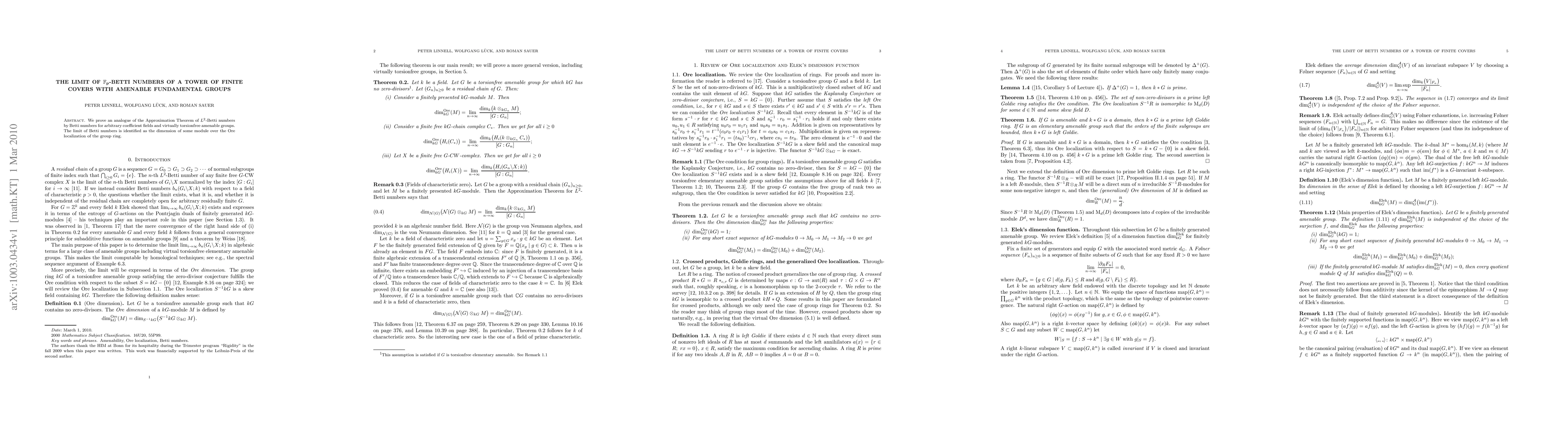 Researchers prove a connection between Betti numbers of tower covers and module dimensions over group ring Ore localization for virtually torsionfree amenable groups, establishing an analogue to the Approximation Theorem for arbitrary coefficient fields.