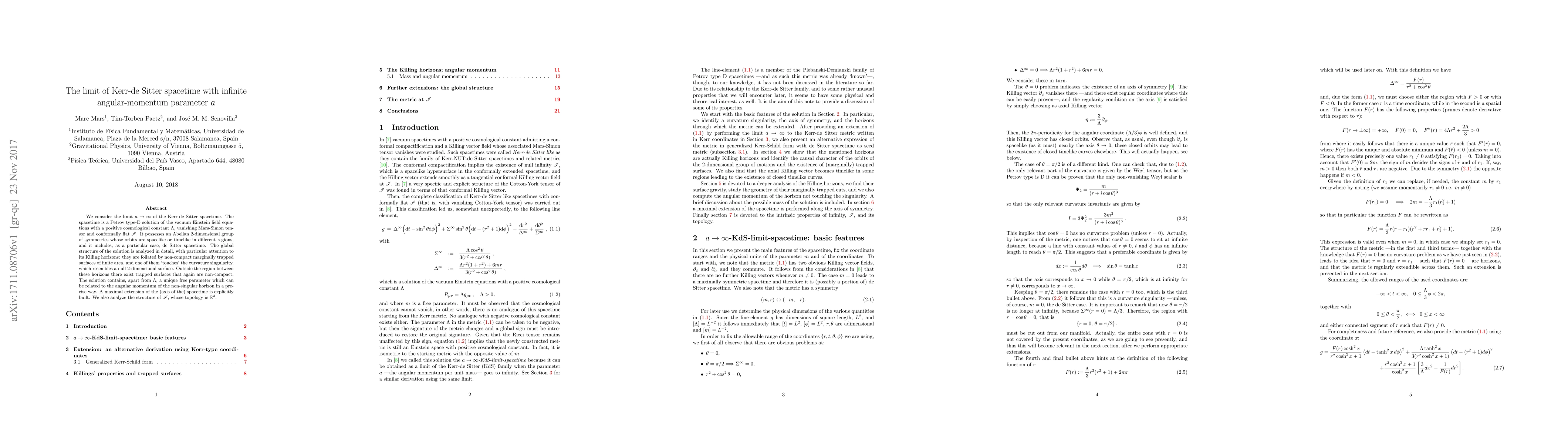 We consider the limit $a\rightarrow \infty$ of the Kerr-de Sitter spacetime. The spacetime is a Petrov type-D solution of the vacuum Einstein field equations with a positive cosmological constant $\Lambda$, vanishing Mars-Simon tensor and conformally flat scri. It possesses an Abelian 2-dimensional group of symmetries whose orbits are spacelike or timelike in different regions, and it includes, as a particular case, de Sitter spacetime. The global structure of the solution is analyzed in detail, with particular attention to its Killing horizons: they are foliated by non-compact marginally trapped surfaces of finite area, and one of them `touches' the curvature singularity, which resembles a null 2-dimensional surface. Outside the region between these horizons there exist trapped surfaces that again are non-compact. The solution contains, apart from $\Lambda$, a unique free parameter which can be related to the angular momentum of the non-singular horizon in a precise way. A maximal extension of the (axis of the) spacetime is explicitly built. We also analyze the structure of scri, whose topology is $\mathbb{R}^3$.