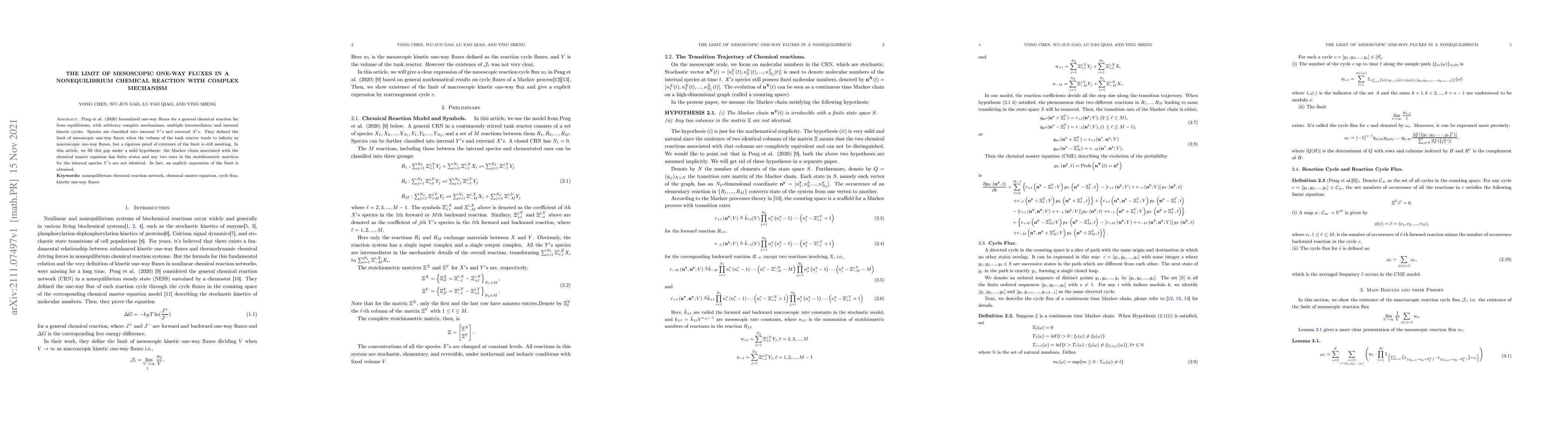Peng et al.(2020) formulated one-way fluxes for a general chemical reaction far from equilibrium, with arbitrary complex mechanisms, multiple intermediates, and internal kinetic cycles. Species are classified into internal Y's and external X's. They defined the limit of mesoscopic one-way fluxes when the volume of the tank reactor tends to infinity as macroscopic one-way fluxes, but a rigorous proof of the existence of this limit is still awaiting. In this article, we fill this gap under a mild hypothesis: the Markov chain associated with the chemical master equation has finite states and any two rows in the stoichiometric matrices for the internal species Y's are not identical. In fact, an explicit expression of the limit is obtained.