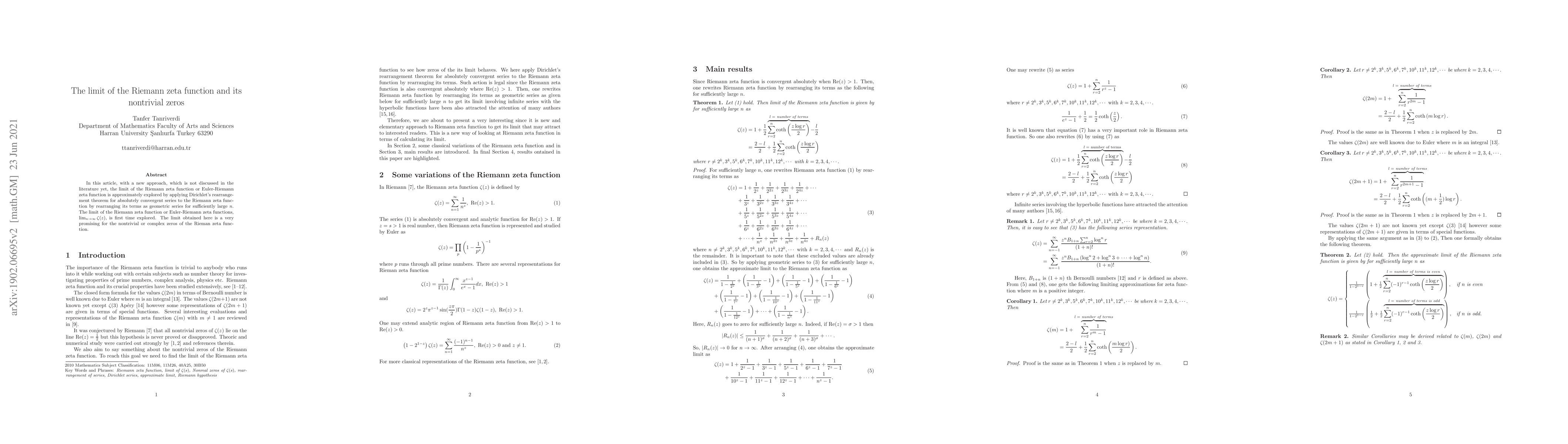 This paper introduces a novel approach using Dirichlet's rearrangement theorem to approximate the limit of the Riemann zeta function as $n$ approaches infinity, revealing potential insights into the nontrivial zeros. The method rearranges the terms of the Riemann zeta function into a geometric series for large $n$.